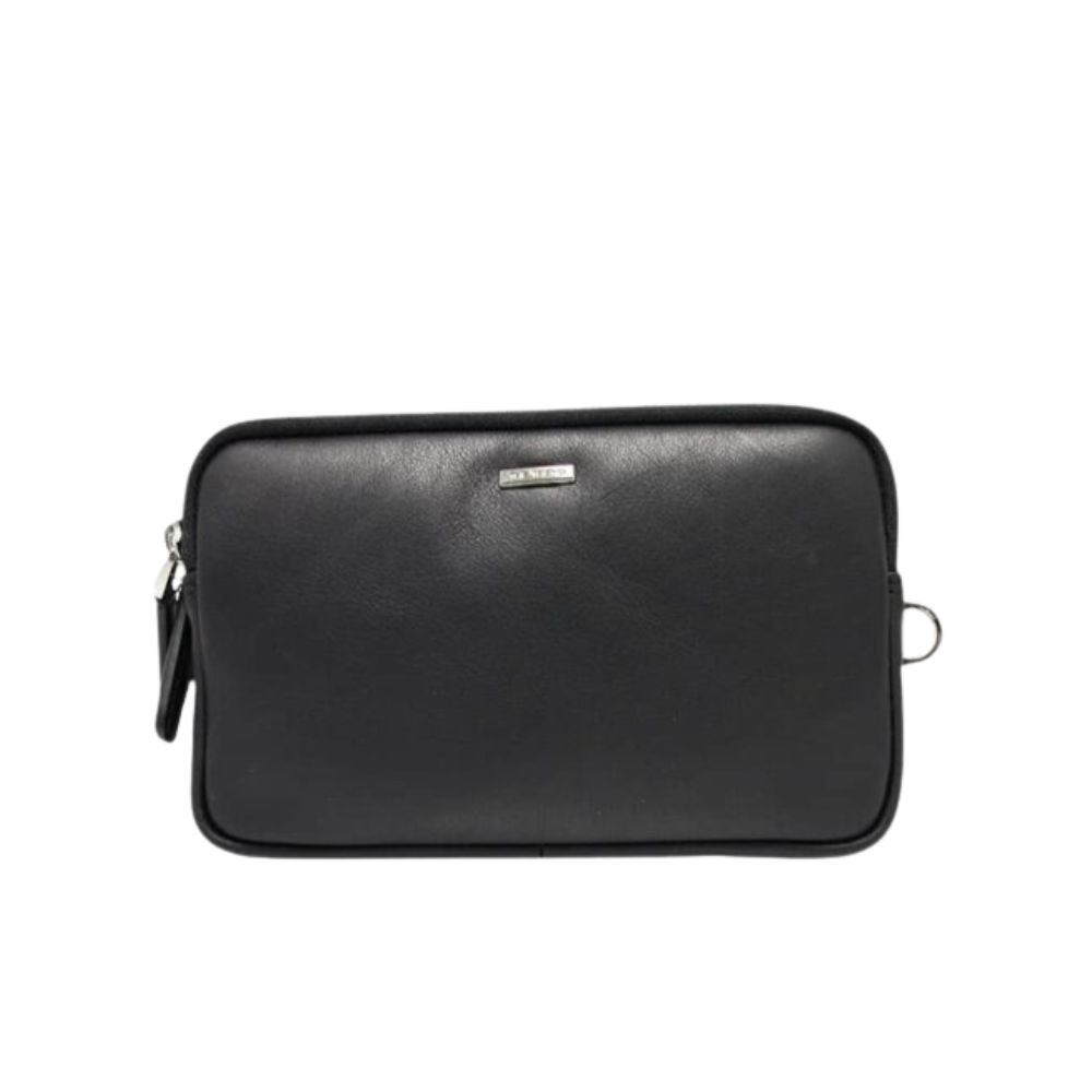 soldesHomme souriant tenant plusieurs paires de chaussures.