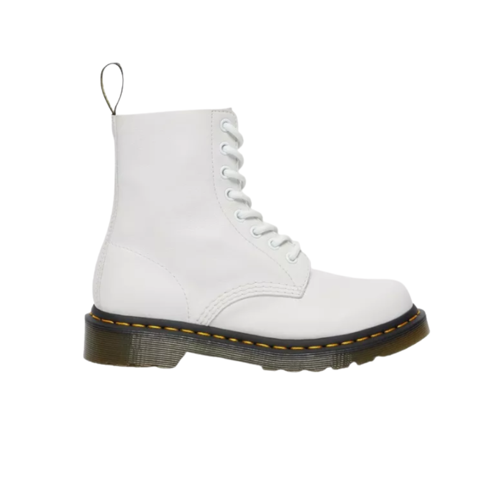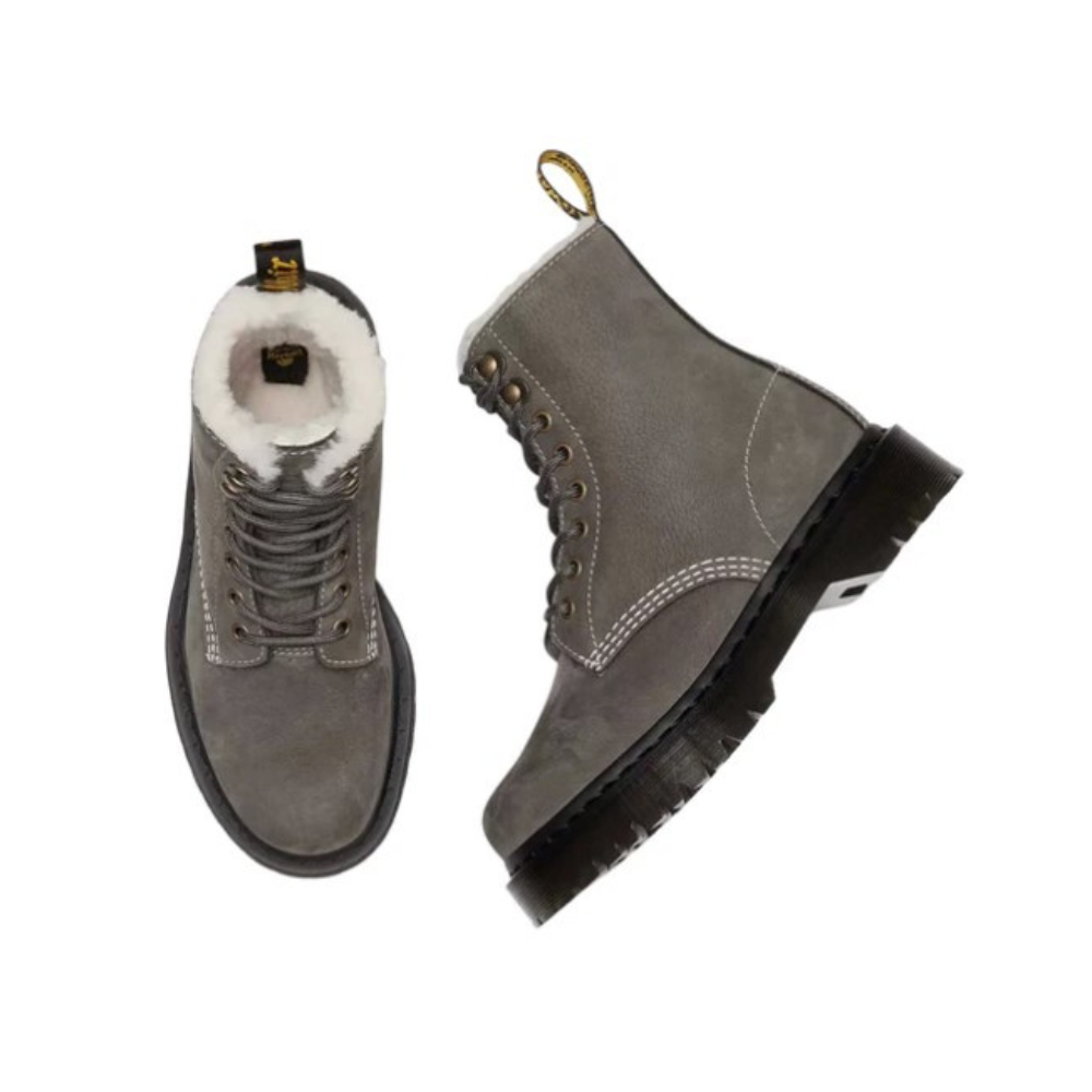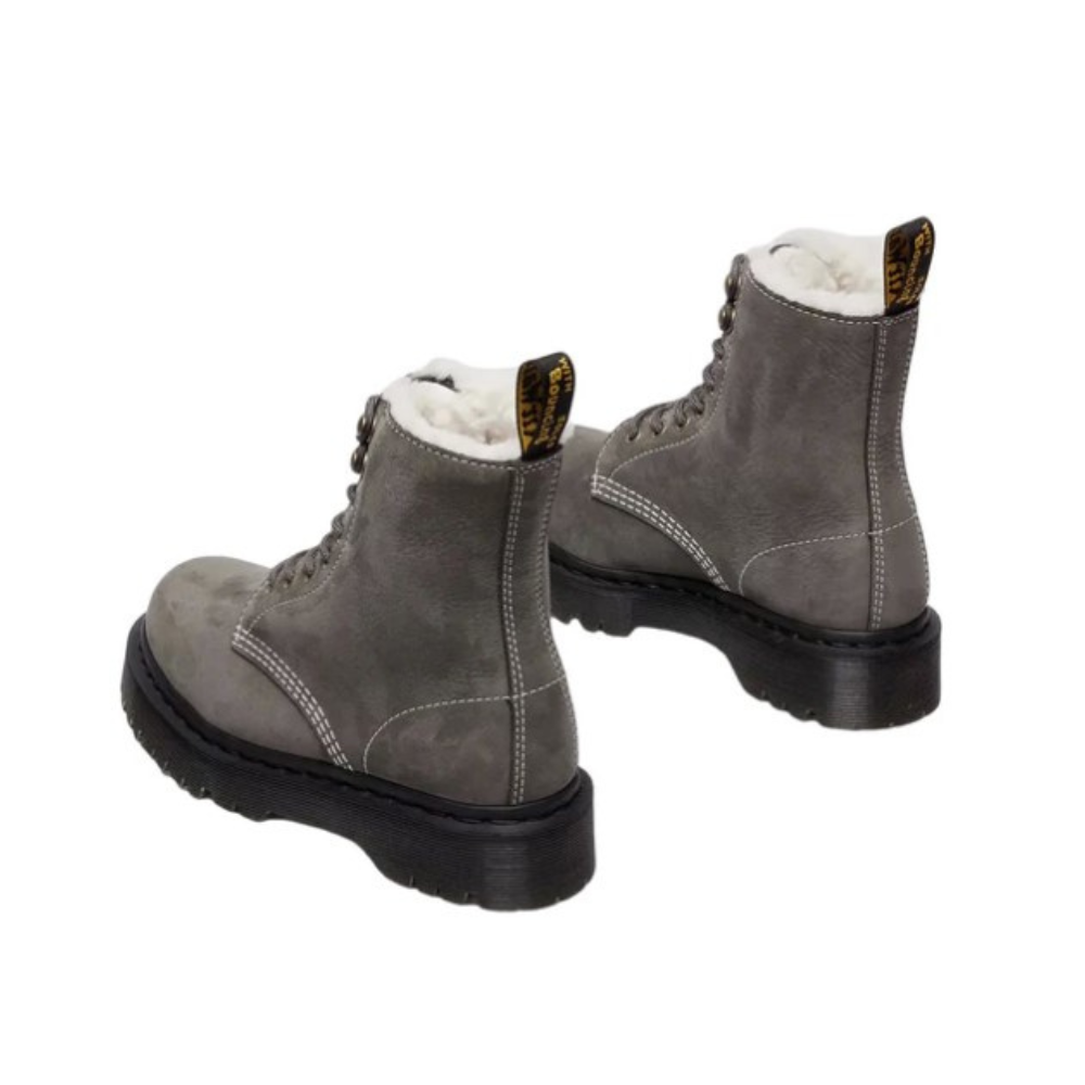 Douce à l’intérieur, résistante par nature. Nous avons renforcé la 1460 Pascal Bex à 8 œillets avec des matériaux techniques prêts à affronter tous les éléments. L’intérieur est doublé de fausse fourrure WarmWair pour garder la chaleur et repousser le froid. L’empeigne est conçue en cuir Milled Nubuck déperlant, souligné de surpiqûres blanches, pour affronter l’humidité tout en offrant un confort immédiat. Les œillets en laiton vieilli contrastent joliment avec le cuir, tandis que la silhouette est complétée par notre languette au talon estampillée, une surpiqûre noire sur la trépointe, et une semelle Bex fumée pour un surplus de hauteur.