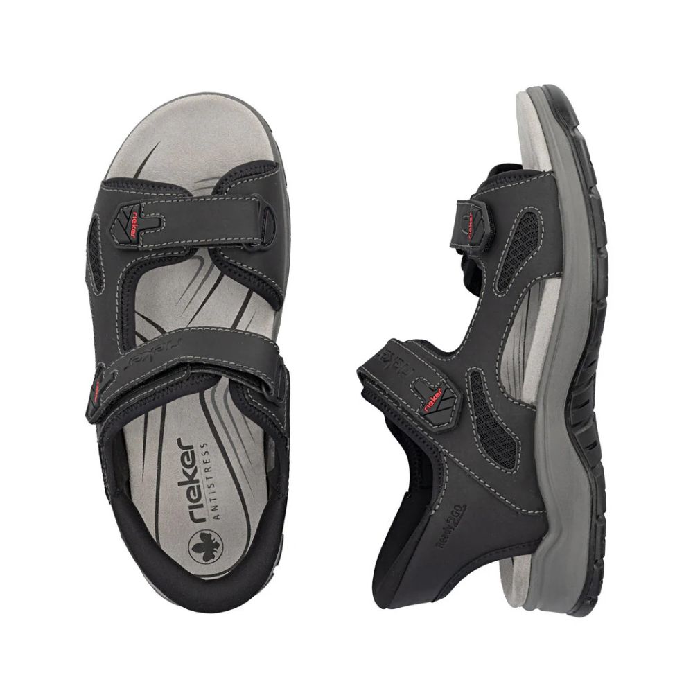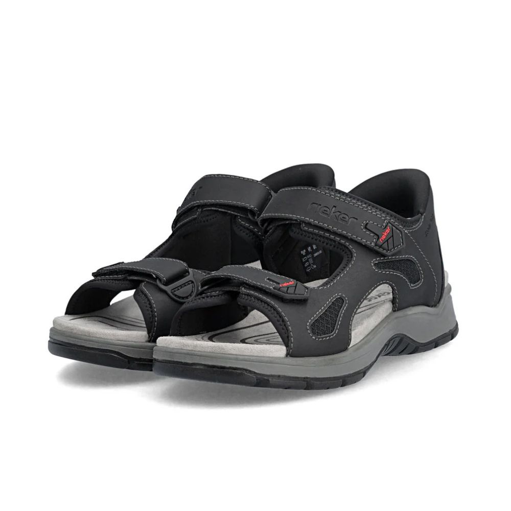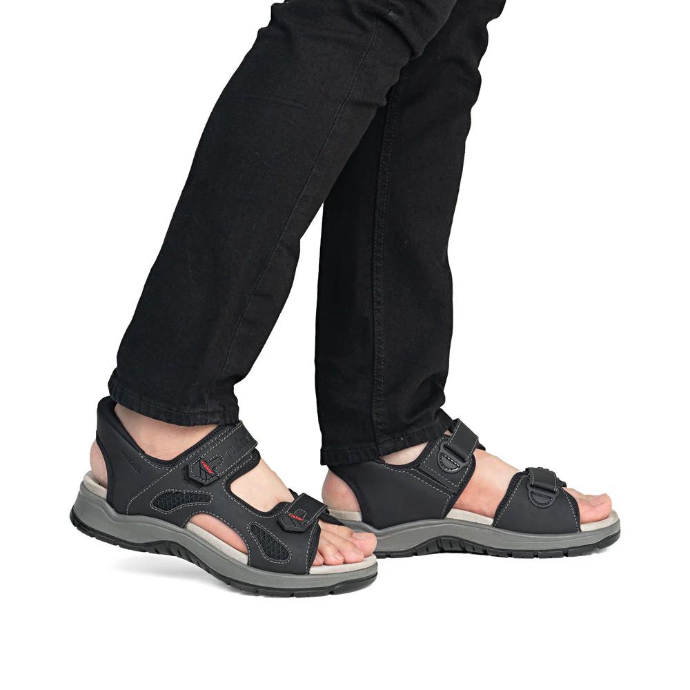 Un confort maximal à chaque pas ! Ces sandales de randonnée noires Rieker sont confectionnées avec soin. La double fermeture auto-agrippante permet un enfilage rapide et assure un maintien parfait. Grâce à leur semelle légère et amortissante, vos pieds bénéficient d'un confort optimal à chaque pas. La largeur confort offre une grande liberté de mouvement aux orteils. Prêtes à enfiler : grâce à leur conception sans lacets, ces sandales s'enfilent en un clin d'œil, sans chausse-pied. Il suffit de les glisser dedans et c'est parti !