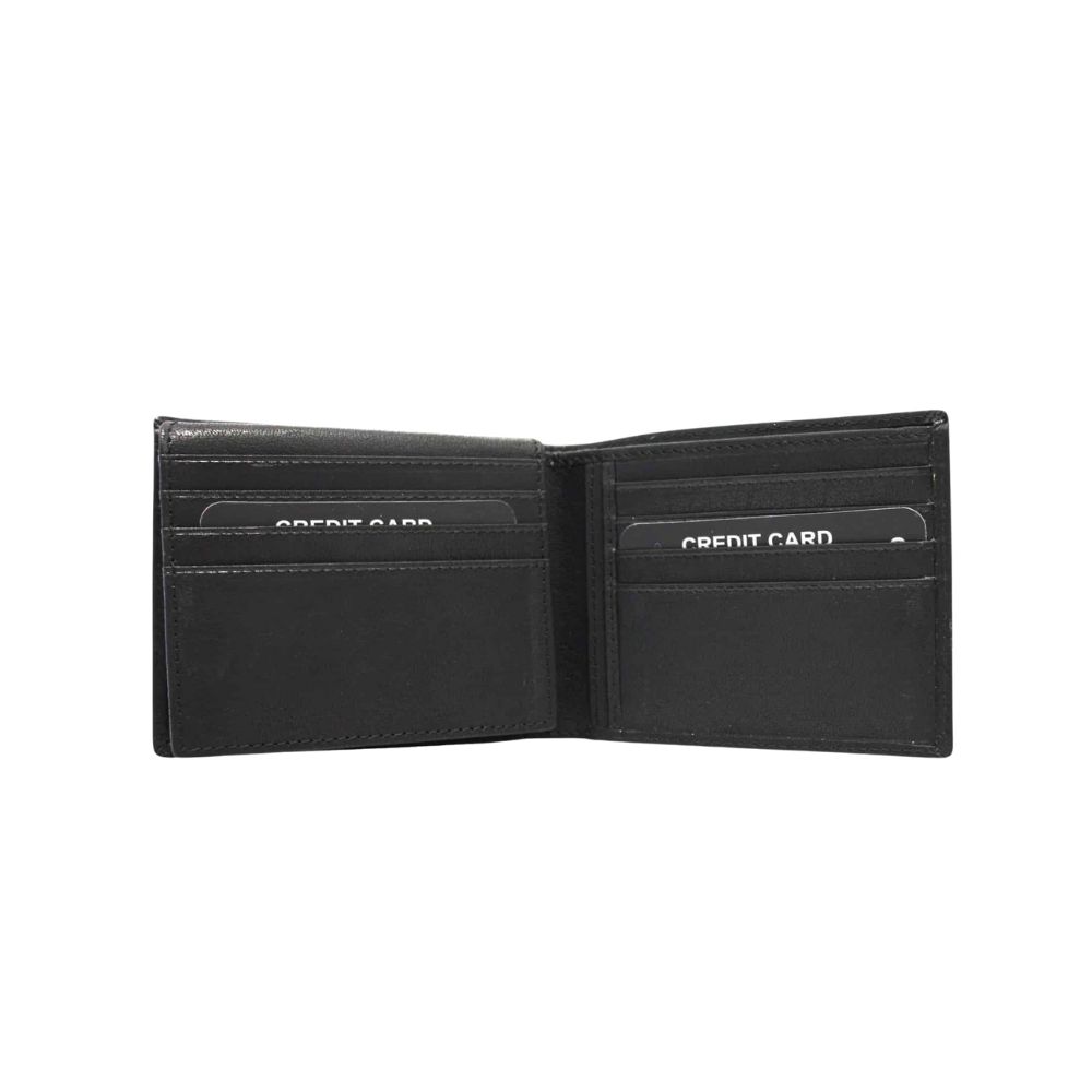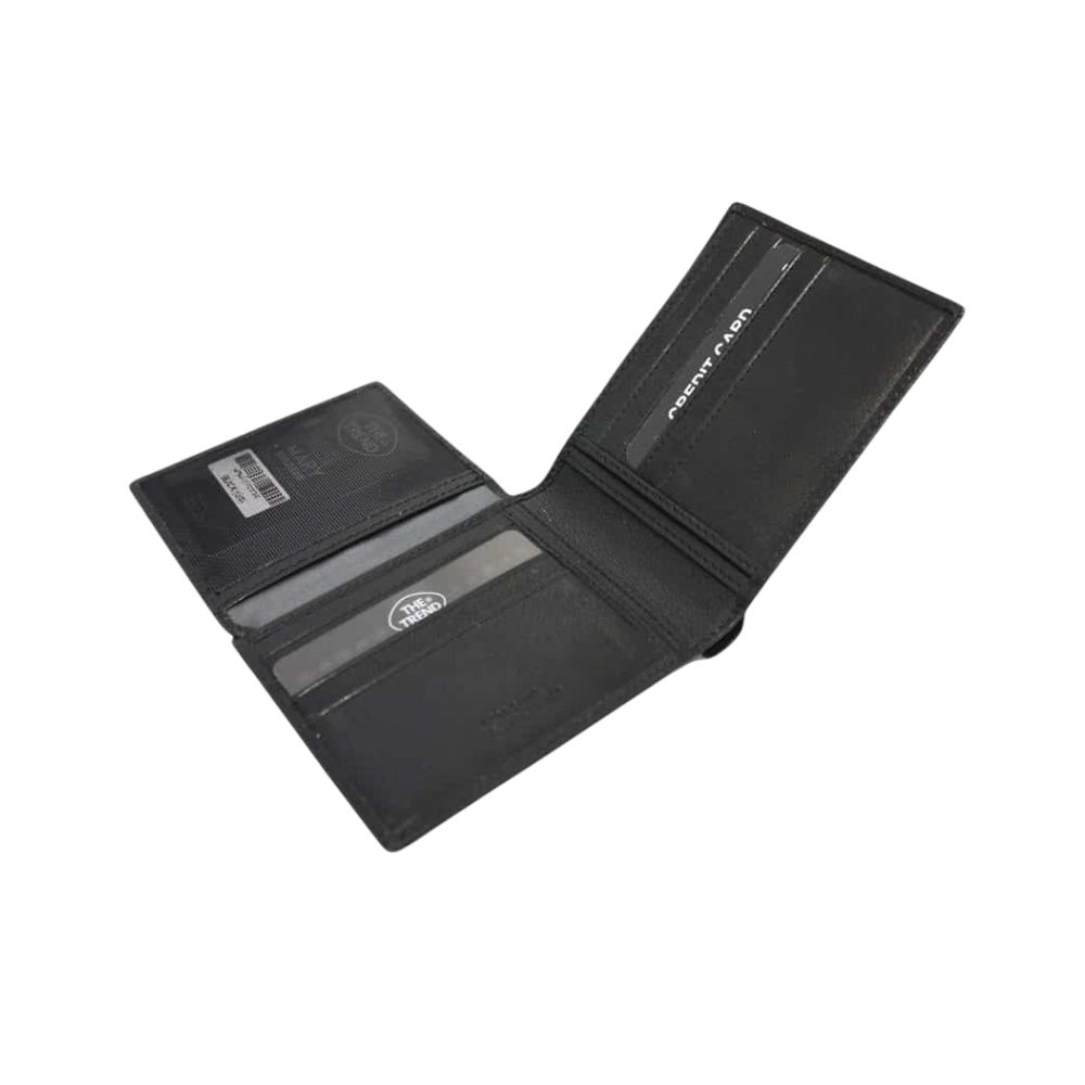 Portefeuille en cuir italien de marque The Trend. Le portefeuille contient plusieurs sections pour les cartes, dont un volet à gauche permettant davantage de sections pour ces dernières. Le verso du volet dispose d’une fenêtre pour carte d’identité. Finalement, le portefeuille dispose d’une double section pour le rangement de l’argent papier.