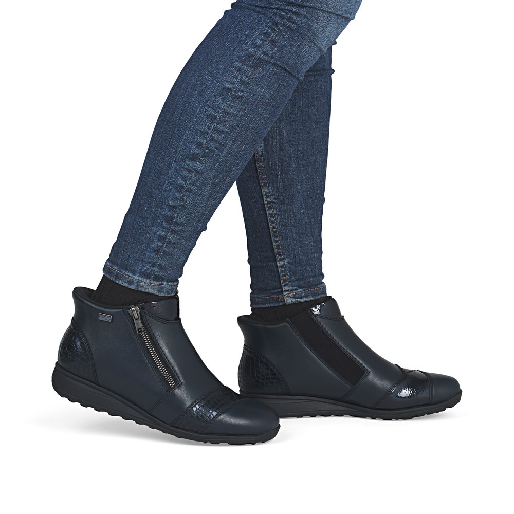 Enfilez-les et c'est parti ! Ces bottines Rieker bleues en cuir lisse vous promettent une sensation de bien-être. La fermeture éclair facilite l'enfilage et le retrait. La semelle adhérente offre un bon maintien. Grâce à la semelle intérieure rembourrée et amovible, ces bottines offrent un confort supplémentaire. De plus, leur largeur supplémentaire offre une plus grande liberté de mouvement à l'avant-pied. La membrane RiekerTEX déperlante protège efficacement de l'humidité, tandis que la technologie Ready2GO assure un enfilage rapide et facile. Vous ferez également un véritable carton en matière de confort grâce à la doublure chaude et douillette. Affrontez les journées froides !