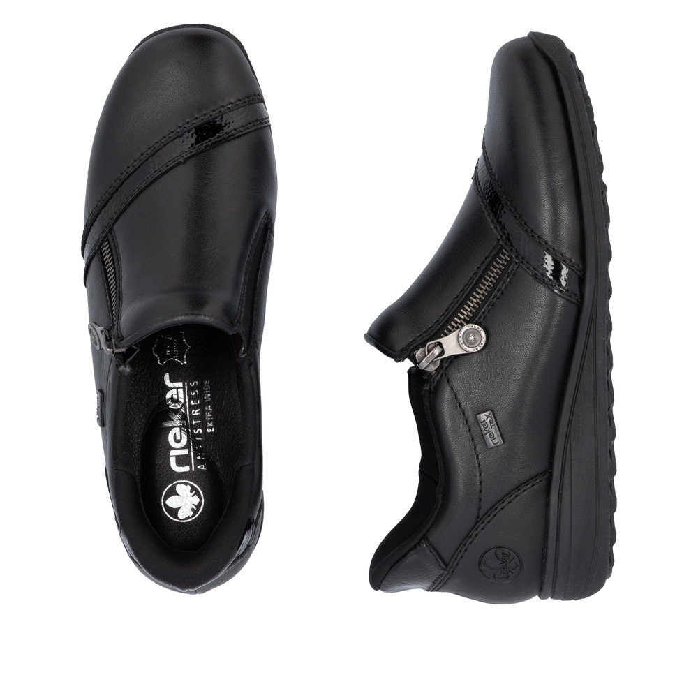 Enfilez-les et c'est parti ! Ces chaussures Rieker noires en cuir lisse allient design tendance, confort optimal et fonctionnalité. La fermeture éclair facilite l'enfilage et le retrait. Grâce à la semelle adhérente, marcher en toute sécurité est un jeu d'enfant. La semelle intérieure rembourrée et amovible offre confort et fonctionnalité au quotidien. La largeur supplémentaire offre une plus grande liberté de mouvement aux orteils. La membrane RiekerTEX offre une protection fiable contre le vent et l'humidité, tandis que la technologie Ready2GO facilite l'enfilage. Enfilez-les et sentez-vous bien !