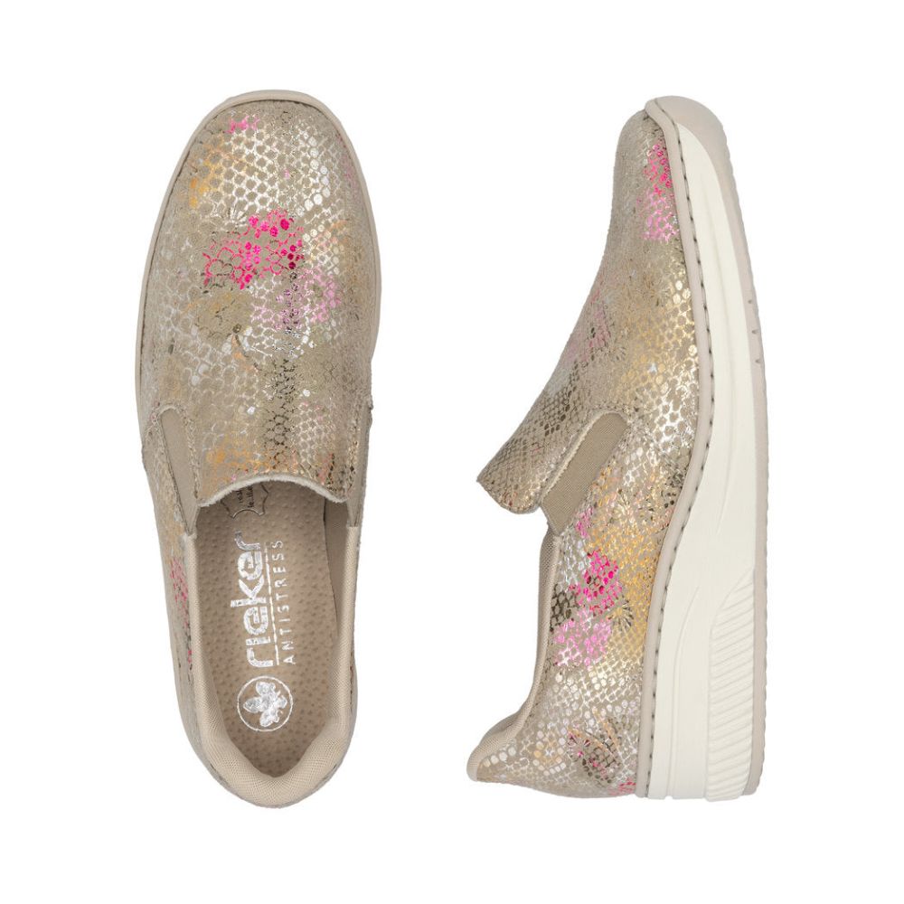 Confortables et pratiques ! Ces chaussures Rieker multicolores allient les dernières tendances mode au confort légendaire de Rieker. Confectionnées selon la méthode traditionnelle cousue-collée, elles sont robustes, souples et offrent un excellent maintien. L'élastique permet de les enfiler et de les retirer facilement et confortablement. La finition métallisée apporte une touche d'élégance et un style unique. La semelle légère et amortissante avec talon compensé assure un confort optimal à chaque pas. Autre atout : la semelle extérieure ultra-douce. Grâce à leur coupe étroite, elles offrent un maintien confortable et ajusté. Les compagnes idéales pour votre prochaine aventure !