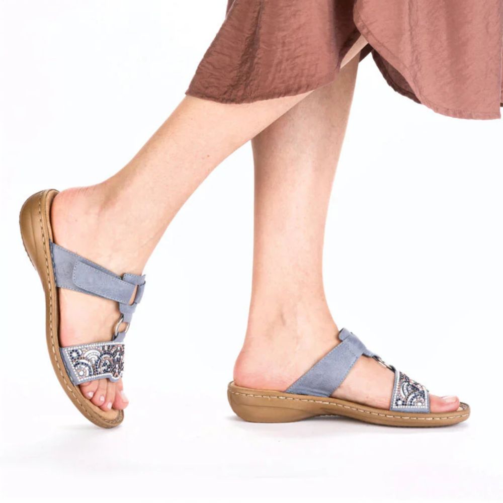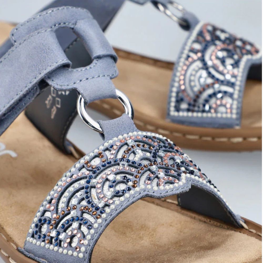 Une chaussure qui a du caractère ! Ces mules Rieker vous plongeront instantanément dans l'ambiance estivale. Grâce à leur construction cousue, elles sont particulièrement résistantes et souples. La fermeture auto-agrippante permet de les enfiler rapidement et assure un maintien parfait. Les strass apportent la touche finale à leur design moderne. La semelle légère et amortissante, avec son talon compensé, garantit un confort optimal à chaque pas. Leur coupe étroite assure un chaussant idéal. Avis aux futures adeptes !