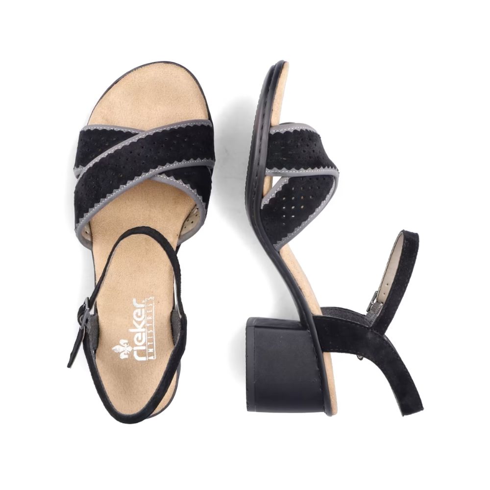 Sandale Rieker 64669-00 noire pour femme. Charmante sandale légère et souple, au design élégant et raffiné. Talon d'environ 5 cm. Semelle et tige en cuir souple.