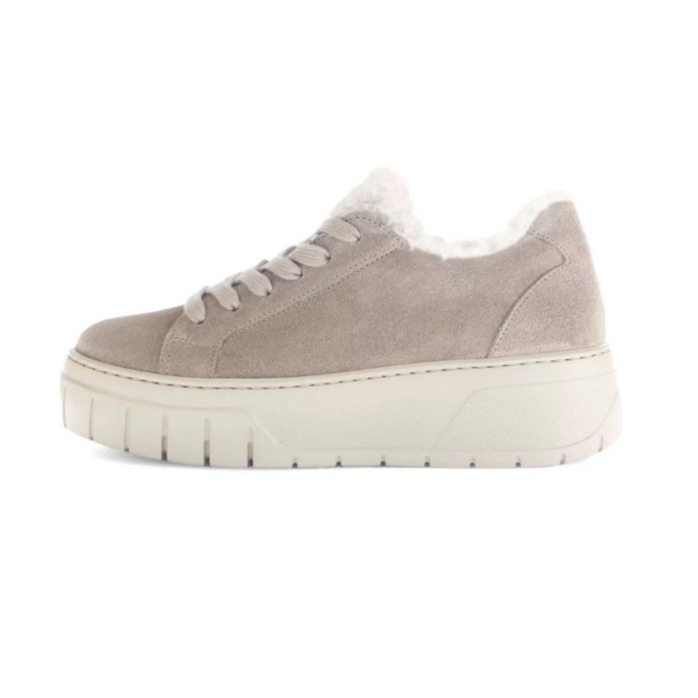 Ces souliers en suède beige sont conçus pour allier chaleur et style, parfaits pour les saisons plus fraîches. Leur doublure intérieure en fausse fourrure blanche offre un confort douillet, tandis que la semelle plateforme texturée assure une bonne adhérence et une touche moderne. Le design épuré est rehaussé par des lacets assortis et un petit détail décoratif sur la languette. Ils incarnent une élégance décontractée avec une attention particulière au bien-être du pied.