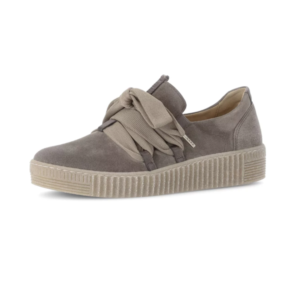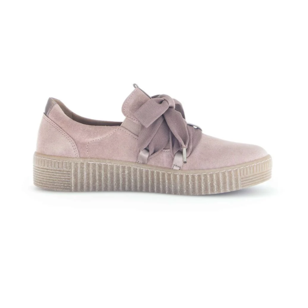Ces souliers en suède rose pâle séduisent par leur douceur visuelle et leur design original. Les larges lacets noués en ruban ajoutent une touche féminine et ludique, tandis que la semelle épaisse nervurée assure confort et stabilité. Le contraste entre la texture veloutée et les détails métalliques des œillets crée un équilibre élégant. Parfaits pour un look décontracté chic, ils allient style et confort avec subtilité.