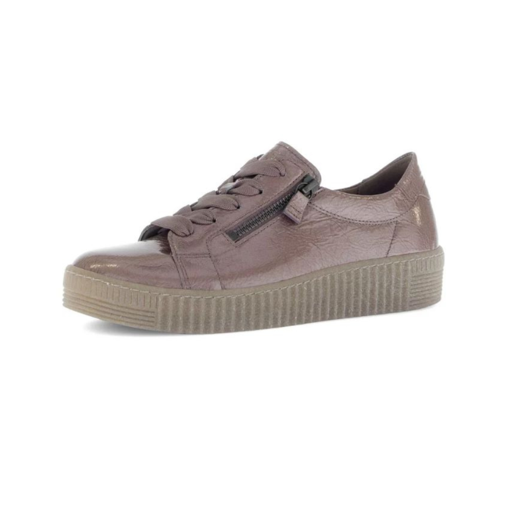 Ces souliers de style basket, en cuir verni mauve, allient élégance et praticité avec leur double système de fermeture : lacets larges et fermetures éclair latérales. Leur finition brillante et leur texture subtile apportent une touche sophistiquée à une silhouette décontractée. La semelle épaisse beige, nervurée pour une meilleure adhérence, assure confort et stabilité au quotidien. C’est une chaussure polyvalente, parfaite pour ajouter de l’élégance à une tenue décontracté.