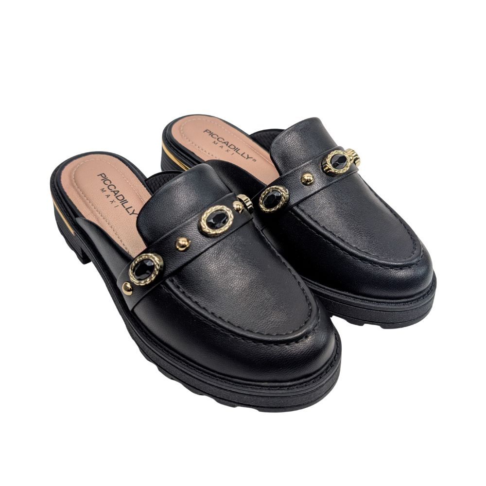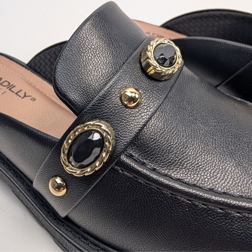 Chic, pratique et ultra-confortable, ce sabot Piccadilly séduit par son design moderne et son élégance discrète. Confectionné en matière noire de qualité, il est sublimé par une bride décorative ornée de détails métalliques raffinés, apportant une touche sophistiquée à un modèle facile à porter.