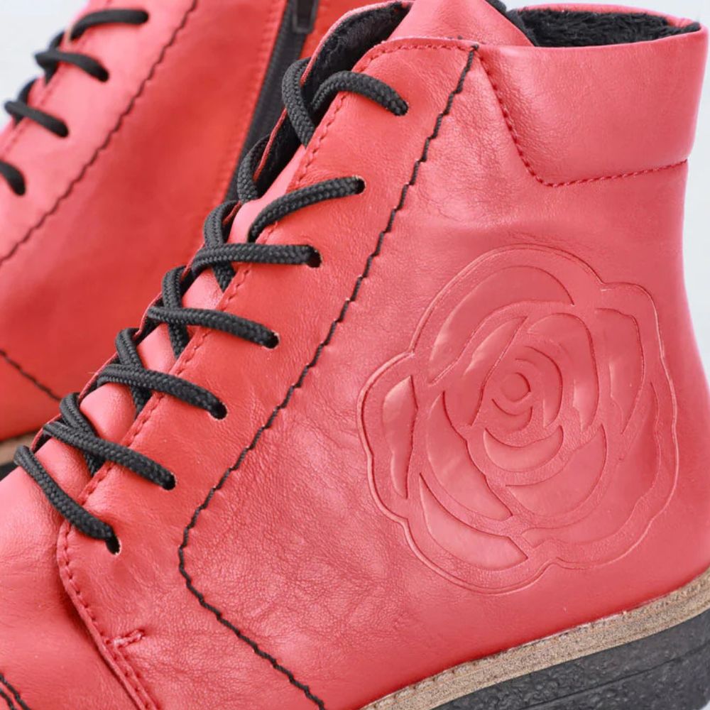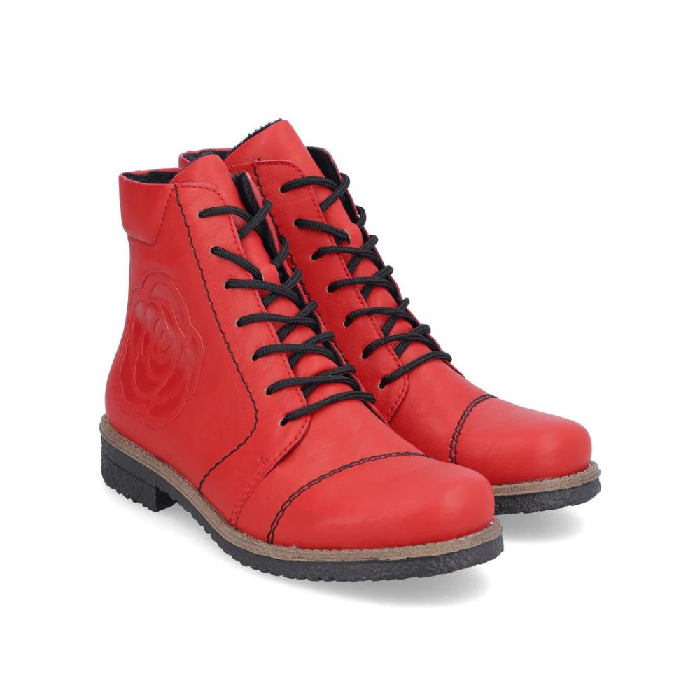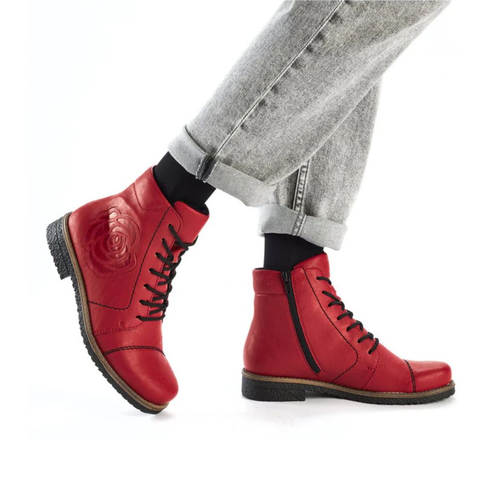 La mode rencontre la fonctionnalité. Ces bottines à lacets rouge clair Rieker séduisent par leur design classique et leur grand confort. Malgré le laçage, la chaussure se ferme facilement grâce à la fermeture éclair. La fleur décorative apporte une touche d'originalité. La semelle adhérente offre un maintien optimal à chaque pas. Autre atout : la semelle extra-souple. Un véritable coup de cœur !