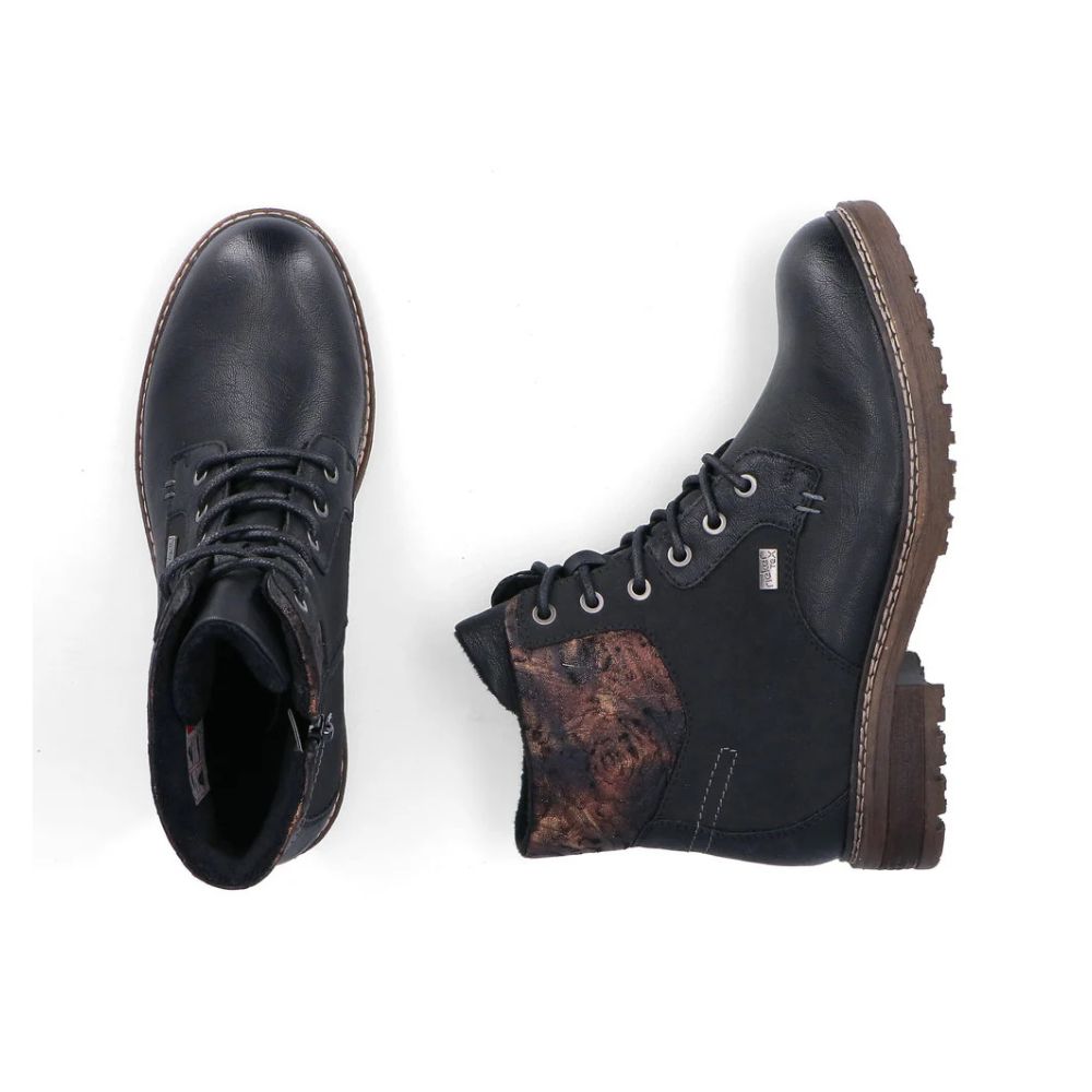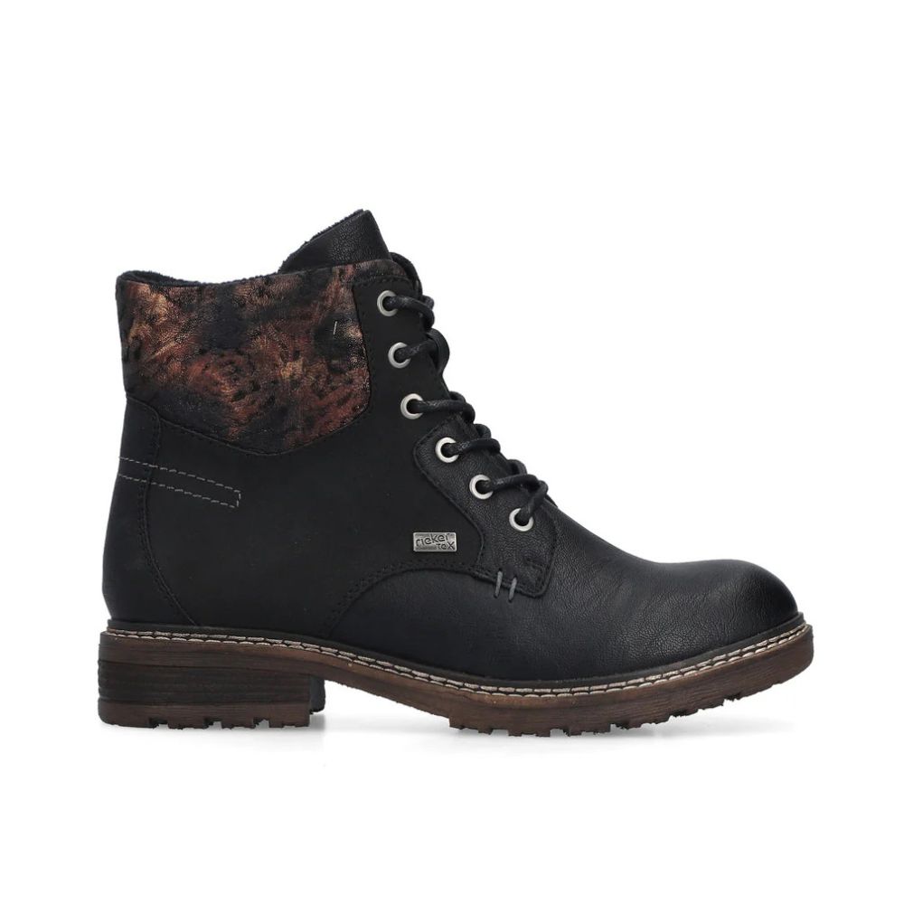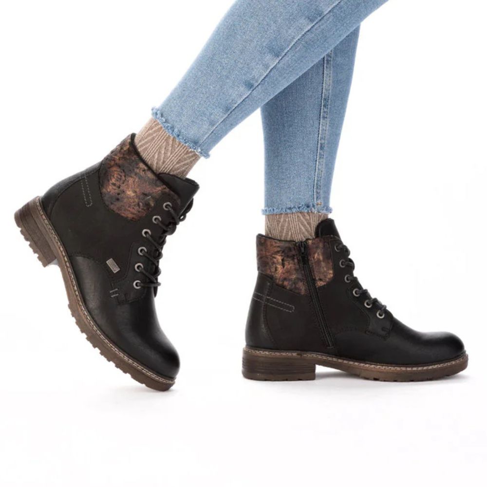 Marcher en toute simplicité, vivre en toute simplicité ! Ces bottines Rieker à lacets sont simples et pratiques. Le laçage complète la fermeture éclair pour plus de fonctionnalité et de confort. Le motif multicolore sur la tige apporte une touche d'originalité. La semelle adhérente offre un bon maintien. Grâce à la membrane RiekerTEX déperlante, un confort optimal est assuré même par temps froid et humide. Plus rien ne vous empêche de longues promenades !