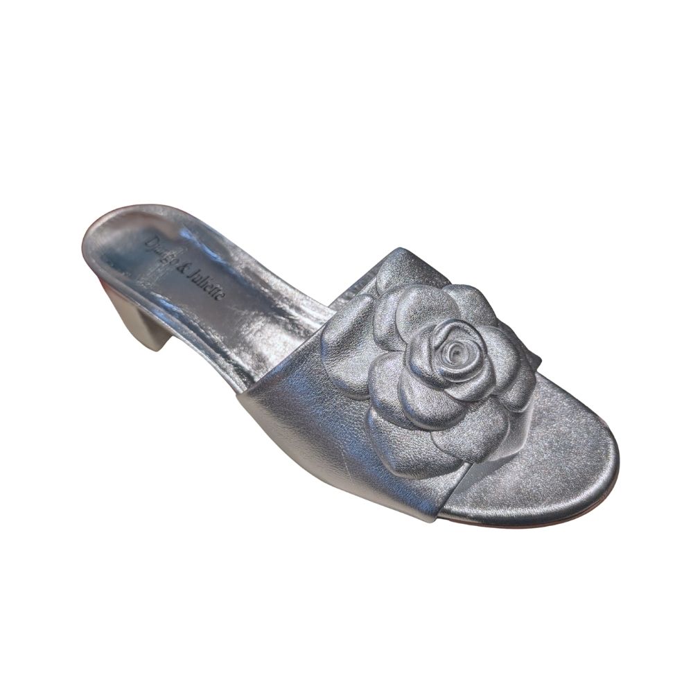Sandale Django & Juliette au style chic et lumineux. Ce modèle mule en cuir métallisé argent est doté d’un talon moyen stable et d’une large bride ornée d’un détail floral élégant, apportant une touche féminine et sophistiquée. Facile à enfiler et confortable, elle est parfaite pour rehausser vos tenues de jour comme de soirée.