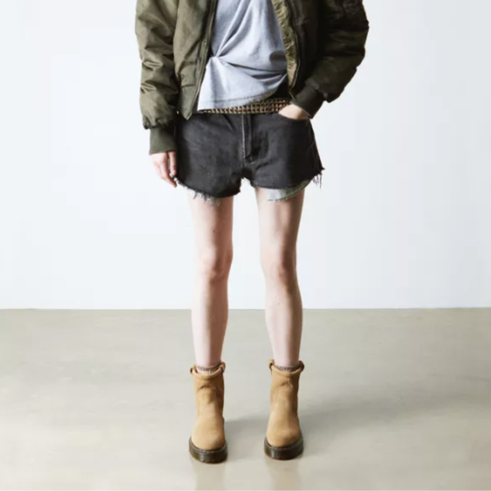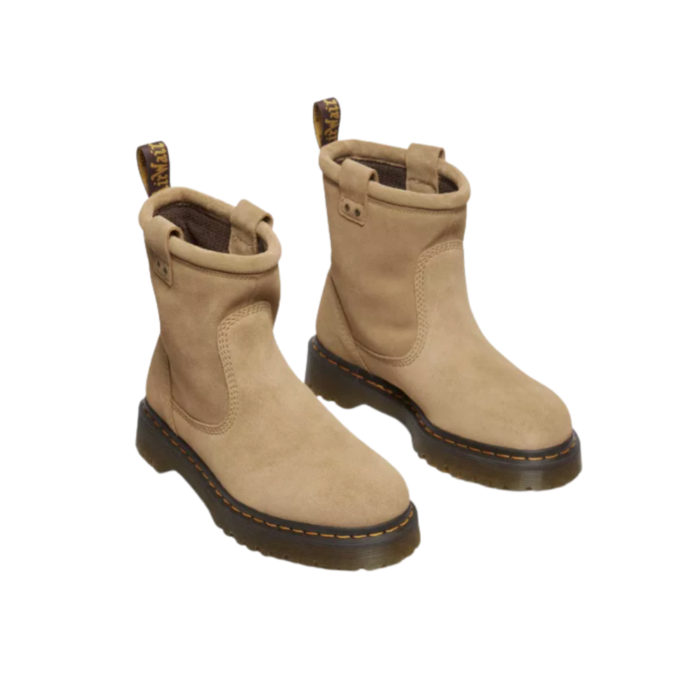 Découvrez cette nouvelle version de nos biker boots Aniston Lo, réalisée en daim Bronx brut avec des anneaux en cuir et des œillets à logo. Cette paire repose sur notre semelle Bex haute, soulignée de rainures et de surpiqûres jaunes Dr. Martens. Retrouvez de plus une boucle d'enfilage jaune et marron foncé au talon.