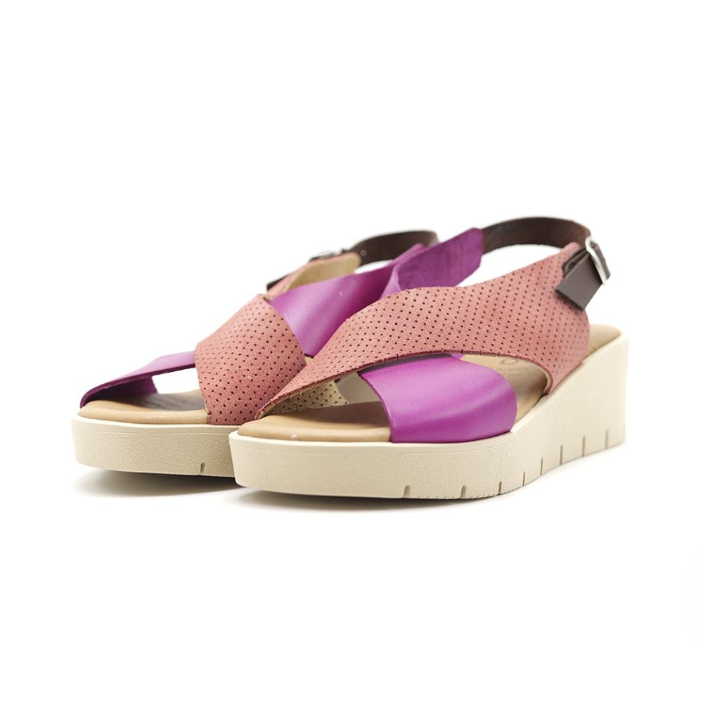 Conçues et fabriquées en Espagne à partir de cuir 100 % recyclé, ces sandales allient élégance et engagement écologique. La semelle intérieure en cuir Comfort Gel assure un excellent amorti et un confort optimal tout au long de la journée. Leur design raffiné aux teintes rose et violet s’adapte facilement à toutes les tenues.