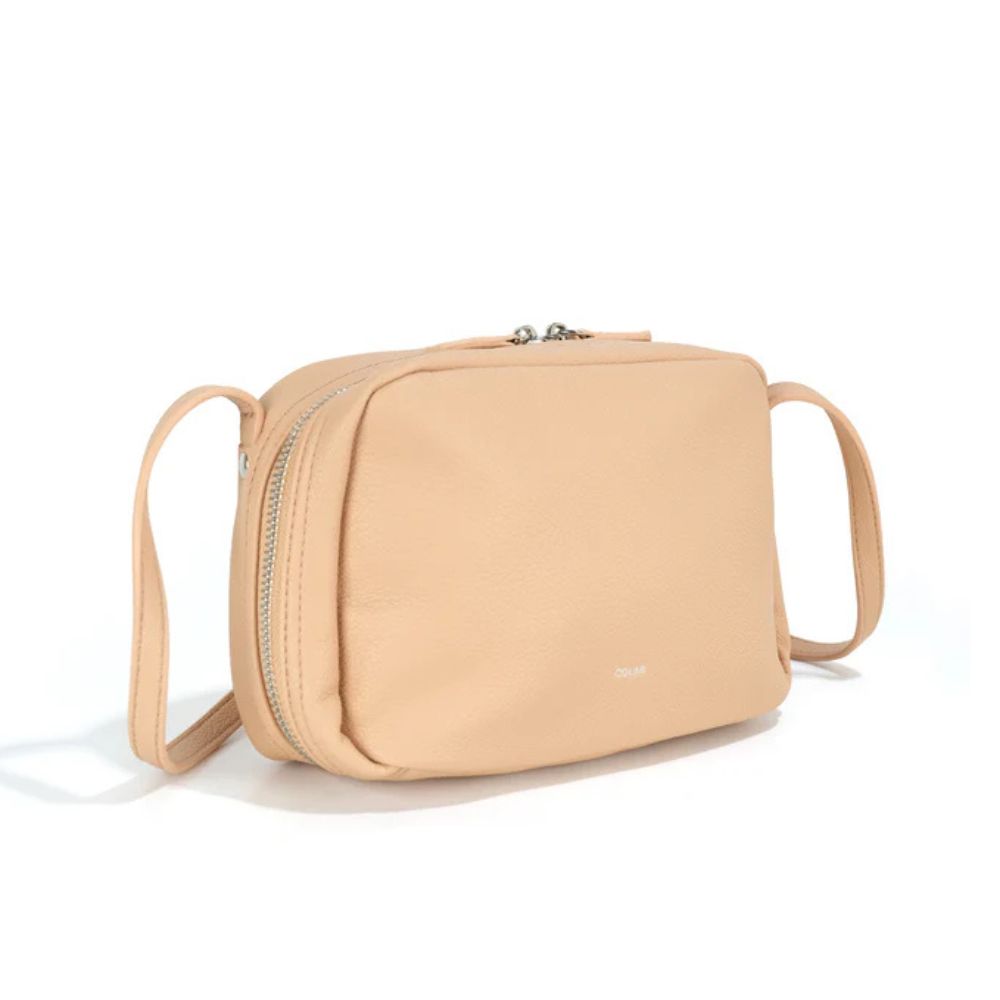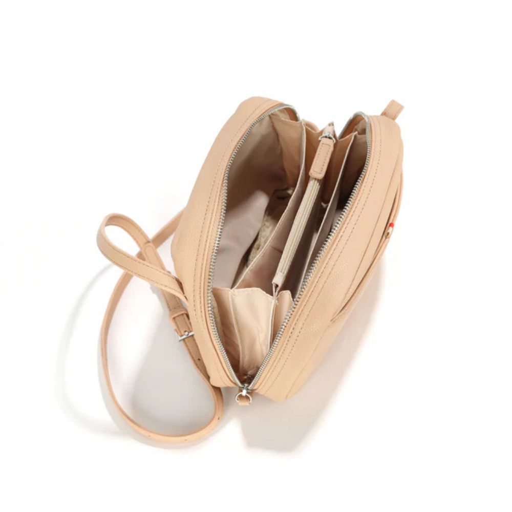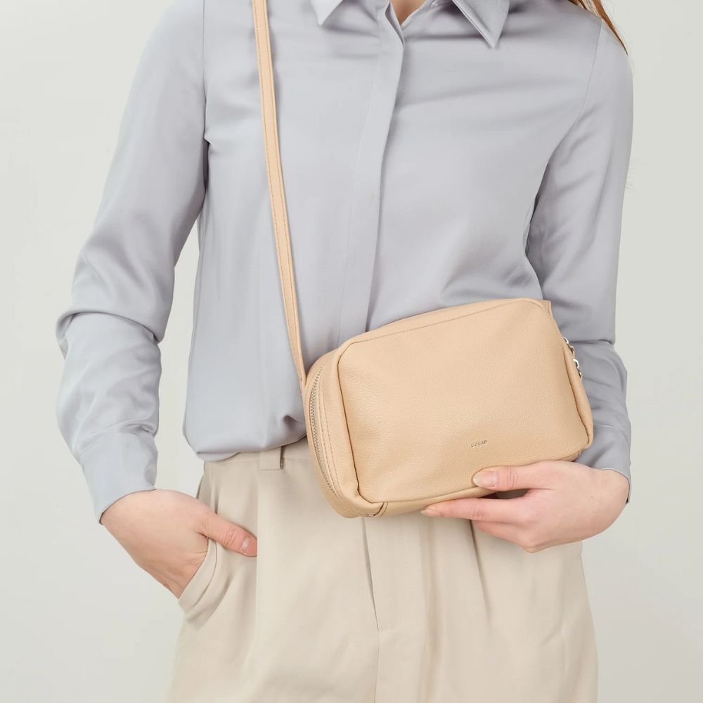 Sac compact en cuir végétalien texturé recyclé, alliant style et praticité. Il est doté d’une fermeture éclair en métal, d’une poche arrière coulissante et d’une bandoulière réglable avec boucle pour un port confortable.