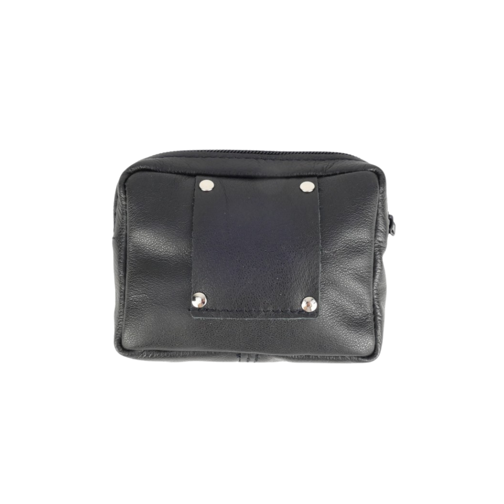 Bourse à la taille en cuir pour homme avec 2 pochettes, une à fermeture éclair, l’autre à rabat fermoir et bouton-pression, se porte à la taille.