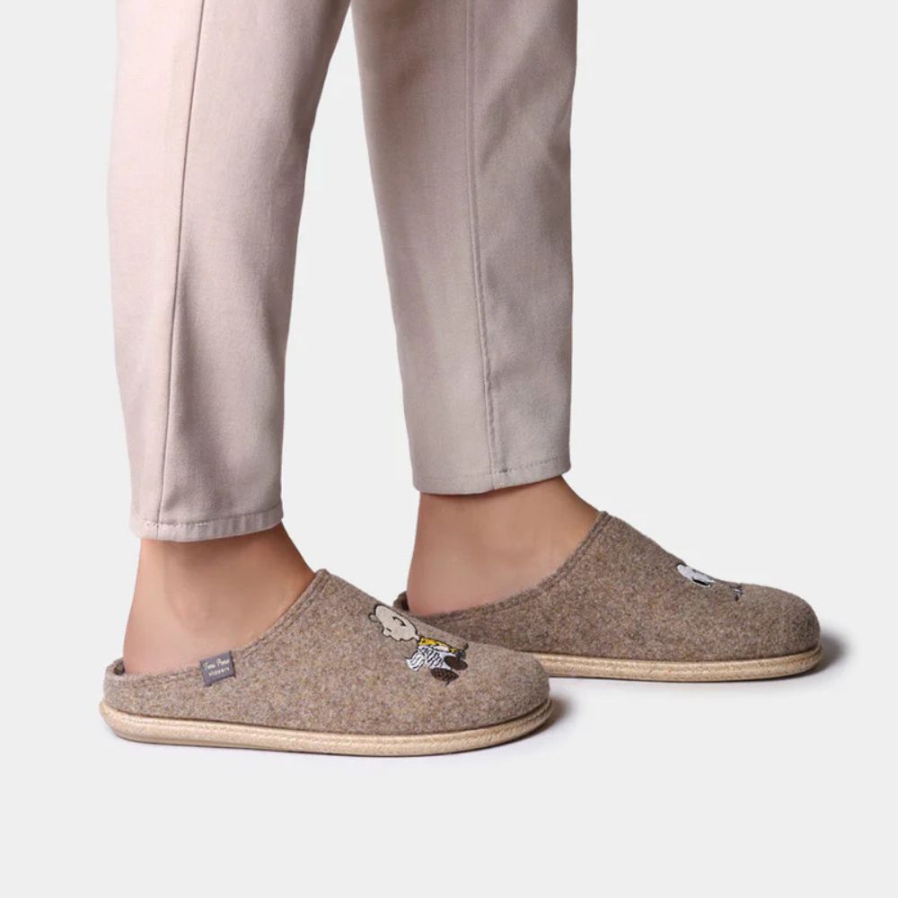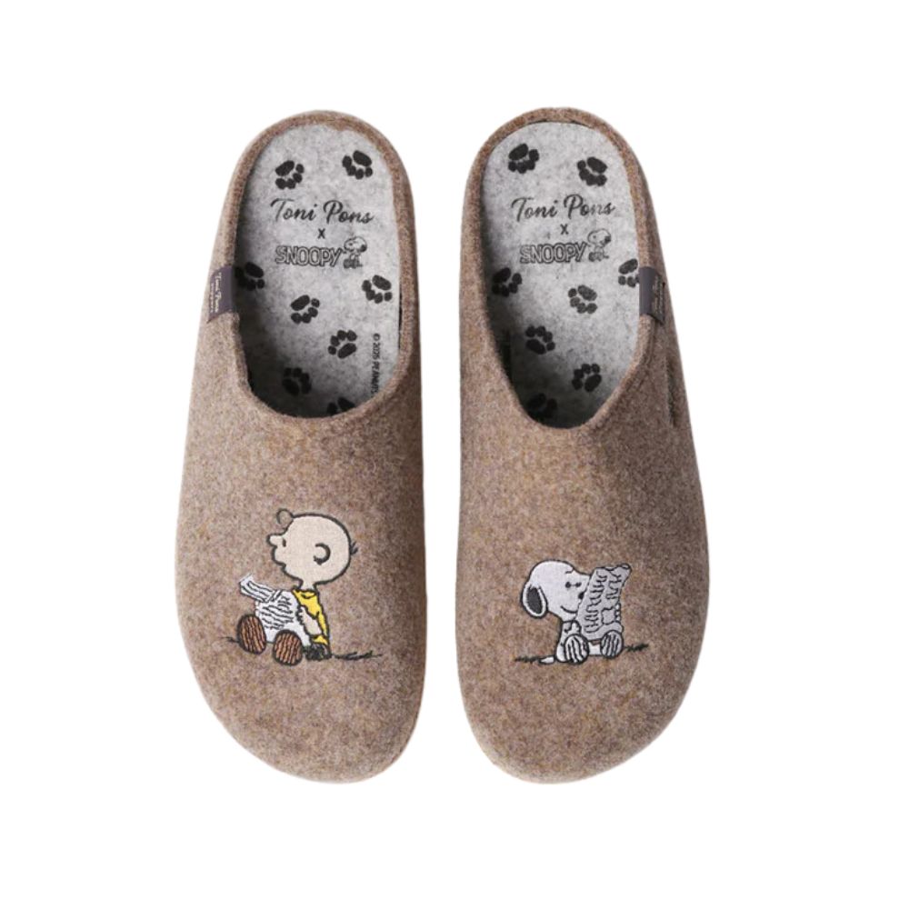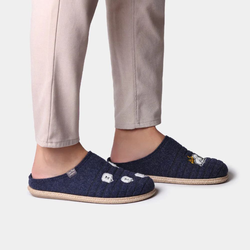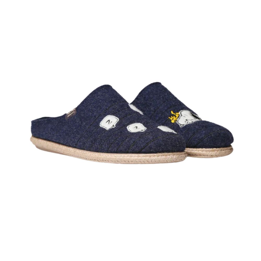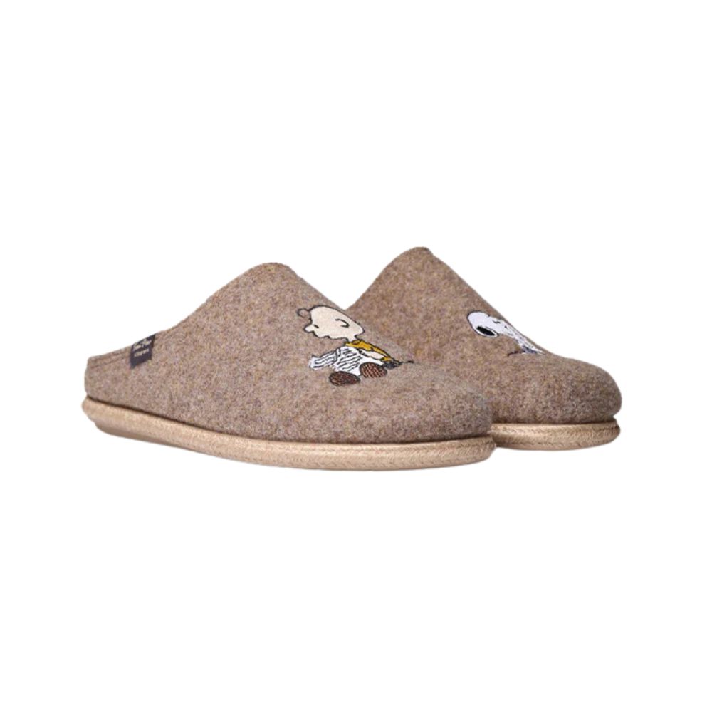 CHARLIE. Ces mules pour homme font partie de la collection capsule Snoopy. Confectionnées en feutre, elles arborent les personnages emblématiques de Snoopy et Charlie Brown sur la tige. La semelle plate de 2 cm d'épaisseur associe caoutchouc et tresse de jute pour un style décontracté et original. Elles sont dotées d'une semelle intérieure amovible avec un talon compensé de 2,5 cm, doublée de tissu pour un confort optimal. La semelle extérieure en caoutchouc antidérapant assure une bonne adhérence.