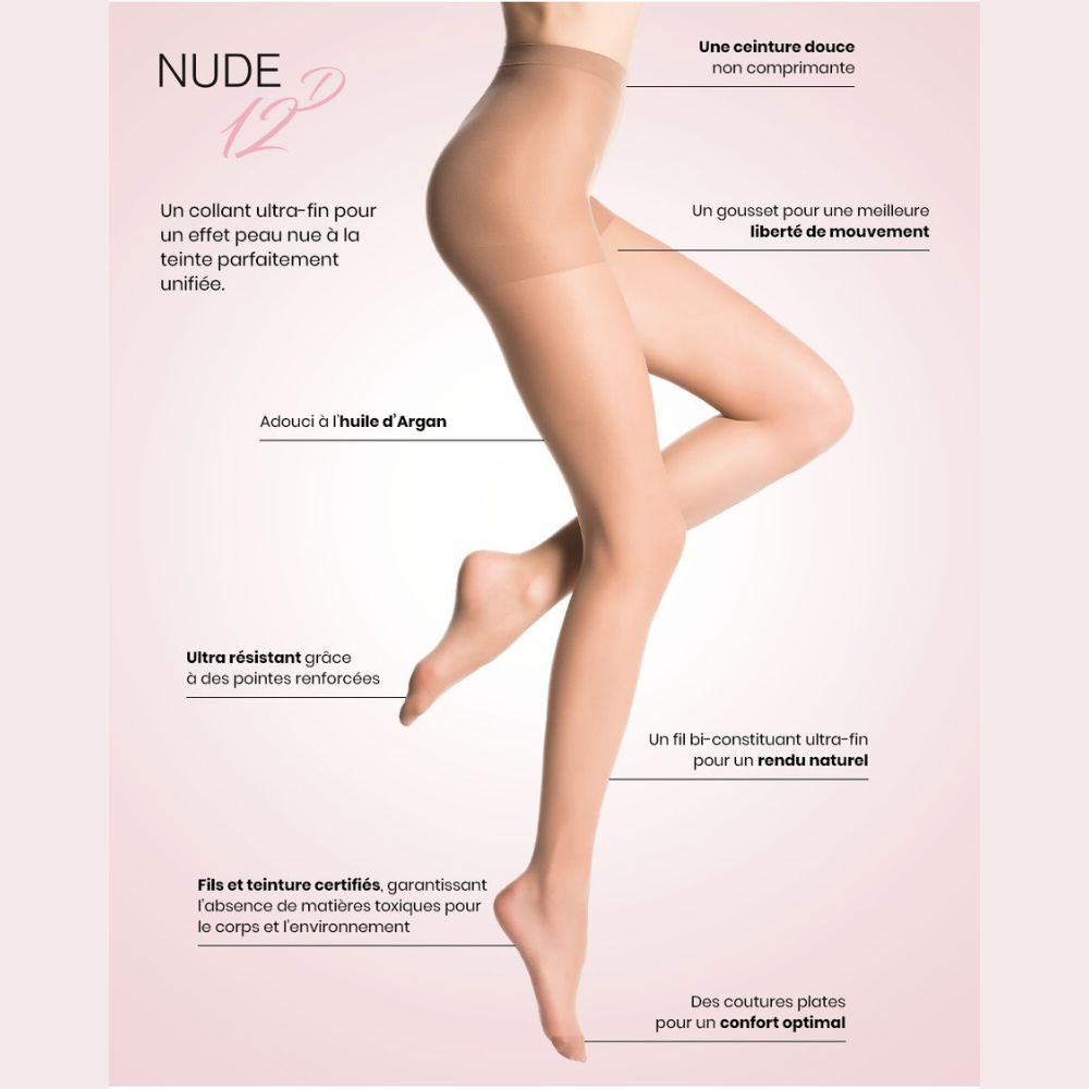 Notre collant Nude transparent 12D, effet peau nue, mise sur l’élégance naturelle de vos jambes. Conçu pour sublimer la couleur naturelle des peaux.