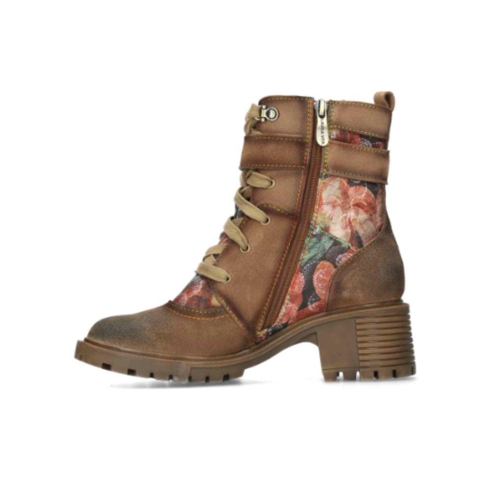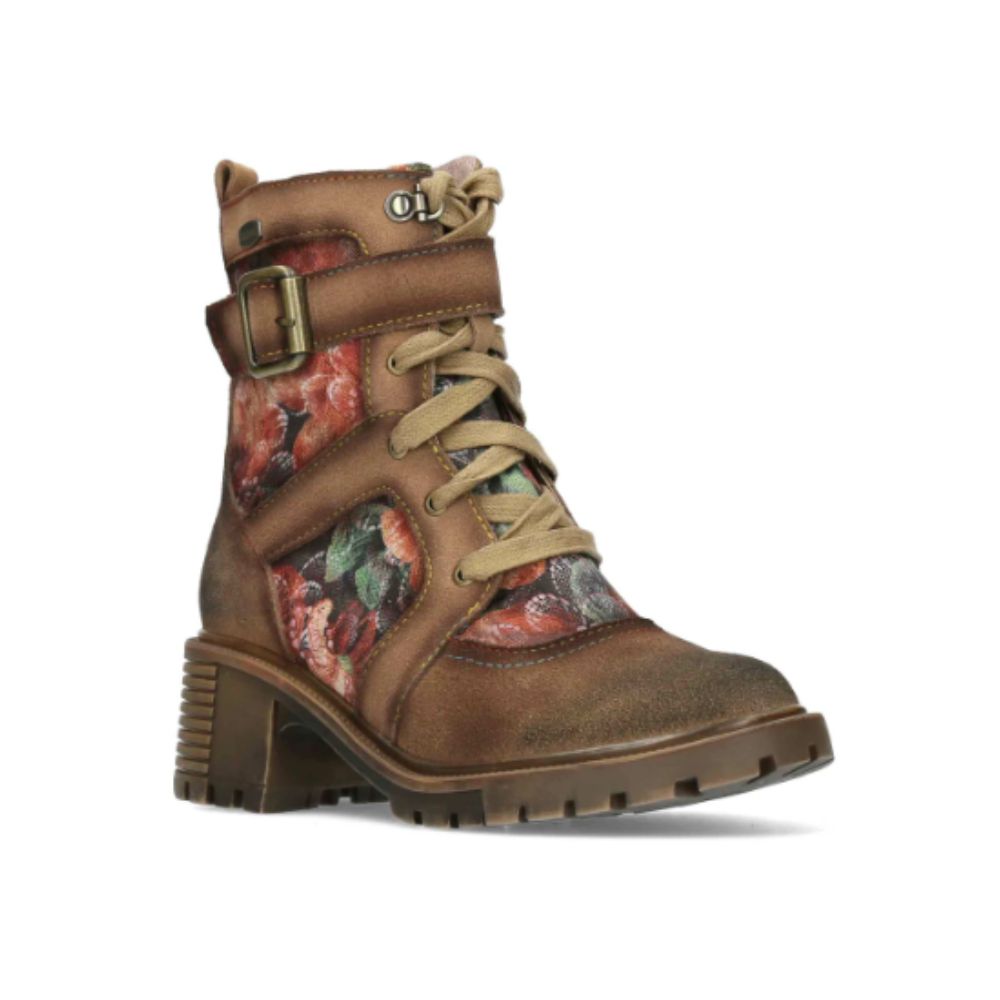 Ce bottillon de la marque française Laura Vita séduit par son style audacieux et raffiné. Proposé dans une élégante teinte tan, il se distingue par ses motifs fleuris qui apportent une touche de fraîcheur et d’originalité. Les lacets assurent un ajustement optimal, tandis que les boucles décoratives soulignent son caractère unique. Pratique au quotidien, le zip latéral permet un enfilage facile. Doté d’un talon de 55 mm, ce modèle allie confort et féminité, idéal pour sublimer vos tenues avec élégance.