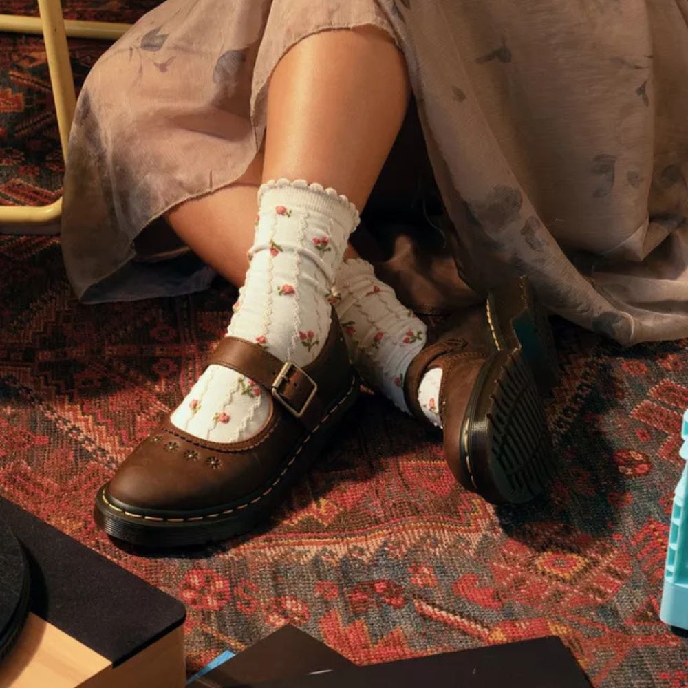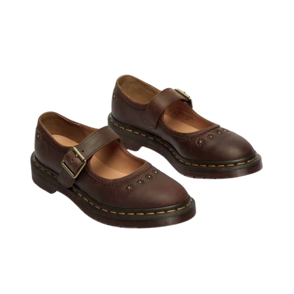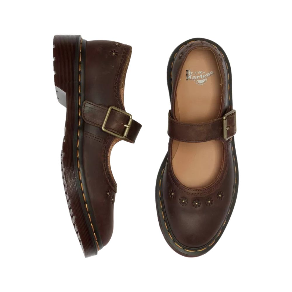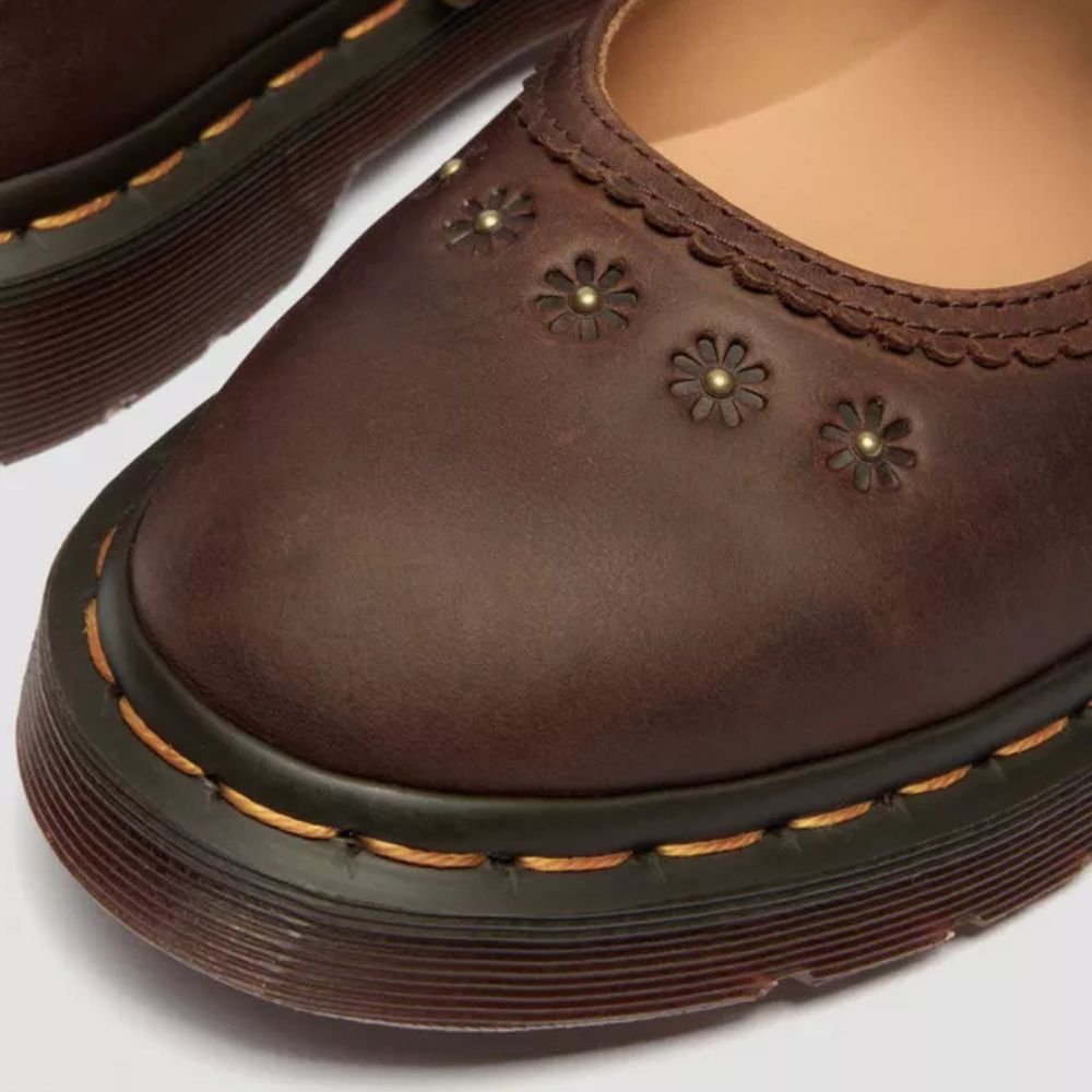 La chaussure Mary Jane Flower revisite une silhouette intemporelle en y insufflant des détails raffinés et un caractère authentique. Confectionnée en cuir Crazy Horse épais à la finition huilée naturelle, elle arbore un aspect vieilli et patiné dès sa sortie de la boîte. Les bords festonnés et les motifs floraux en relief adoucissent l'aspect robuste du cuir, tandis que les pièces métalliques à l'ancienne apportent une touche finale personnalisée. Montée sur une semelle pointue DMS rétro et ornée de nos surpiqûres jaunes emblématiques, cette Mary Jane allie avec brio savoir-faire traditionnel et confort au quotidien.