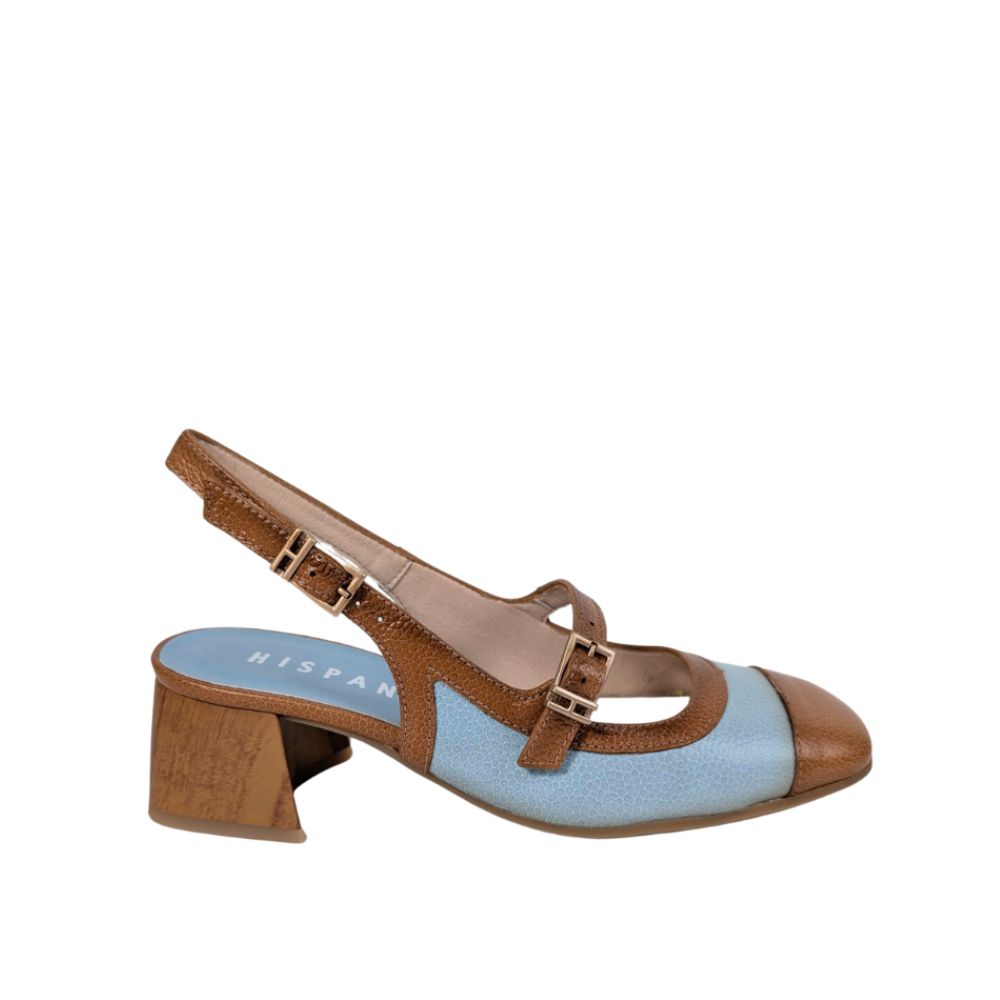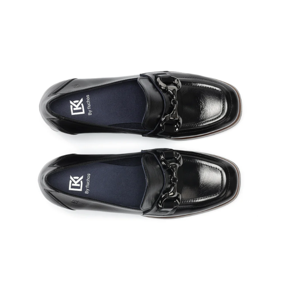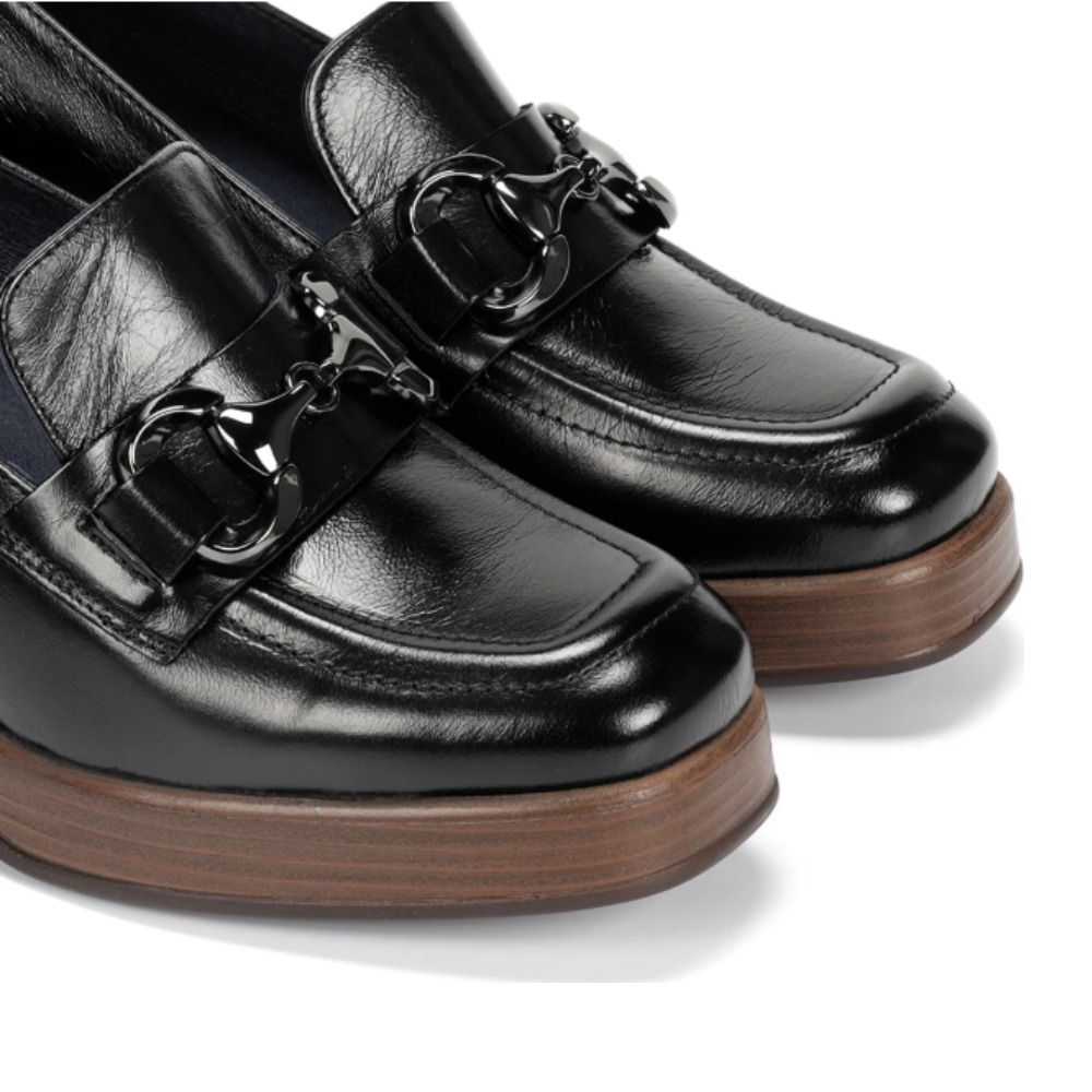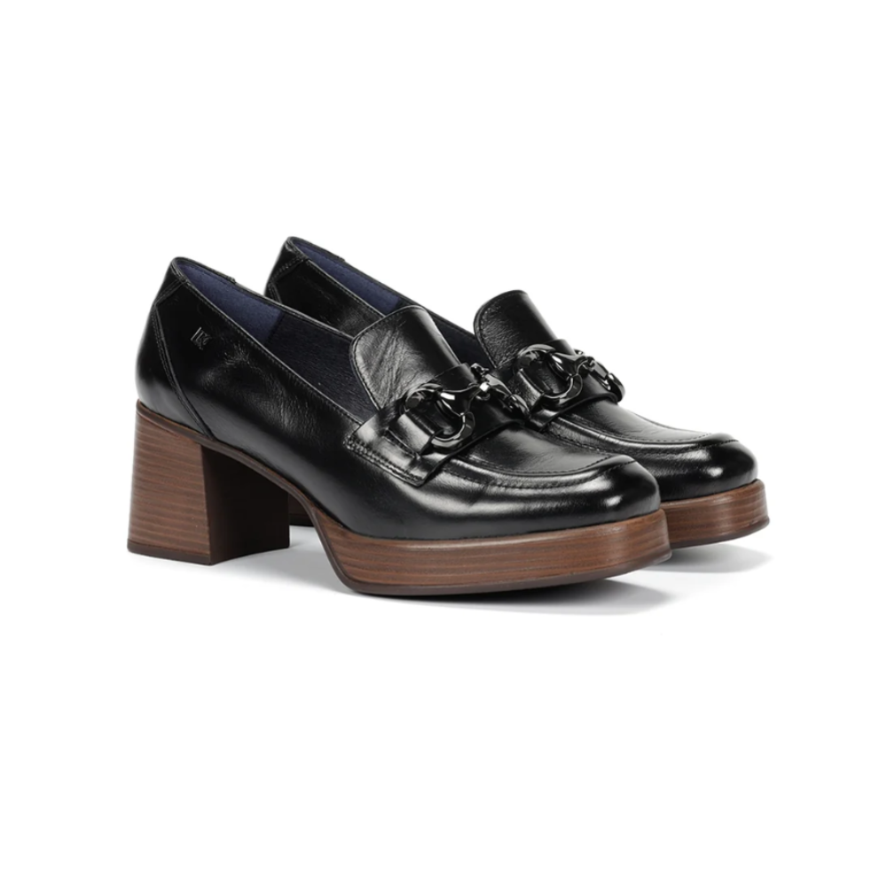 Mocassins Trotteurs de la marque Dorking de couleur noire. Un tige glacée en cuir effet vieilli, mocassins à talon haut massif de 7 cm, une tige marron cognac pour cette nouvelle collection 2024, sur un plateau effet bois de 3 cm de hauteur, un style chic et citadin, hauts trotteurs élégants et confortables signées par la marque espagnole Dorking.