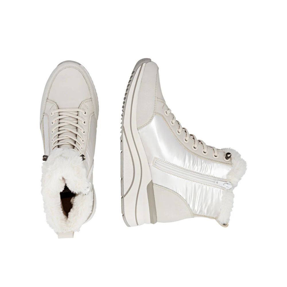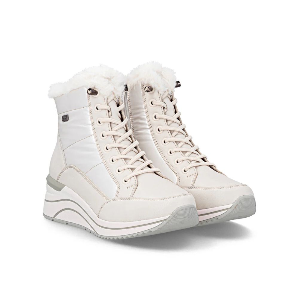 Une sensation de marcher sur un nuage : ces bottines blanches à lacets Remonte ont tout ce qu'il faut pour une chaussure confortable. L'association astucieuse du laçage et de la fermeture éclair garantit un ajustement parfait et un maintien optimal. Des lacets interchangeables sont également inclus. La technologie Lite 'n Soft associe une semelle ultra-légère à une semelle intérieure rembourrée et amovible. De plus, la largeur supplémentaire offre une plus grande liberté de mouvement à l'avant-pied. Vos pieds resteront au chaud toute la journée grâce à la doublure douillette et au sec grâce à la technologie remonteTEX. Profitez des journées froides !