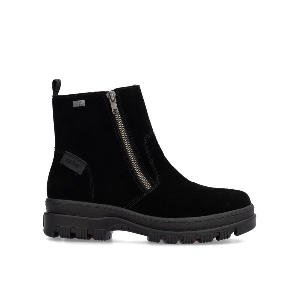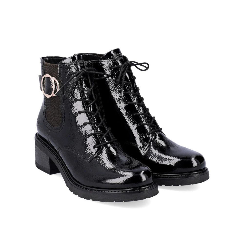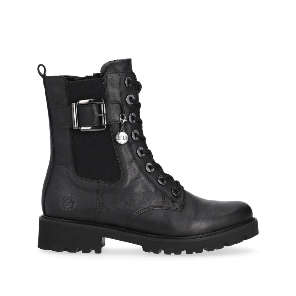 Style et confort vegan ! Ces bottines noires Remonte ont le chic pour vous. Le laçage complète la fermeture éclair et garantit un maintien optimal et un ajustement parfait. La boucle décorative ronde sur le côté attire tous les regards. La semelle intérieure rembourrée et amovible, ainsi que la semelle adhérente et amortissante à talon bloc, complètent ce modèle fonctionnel !