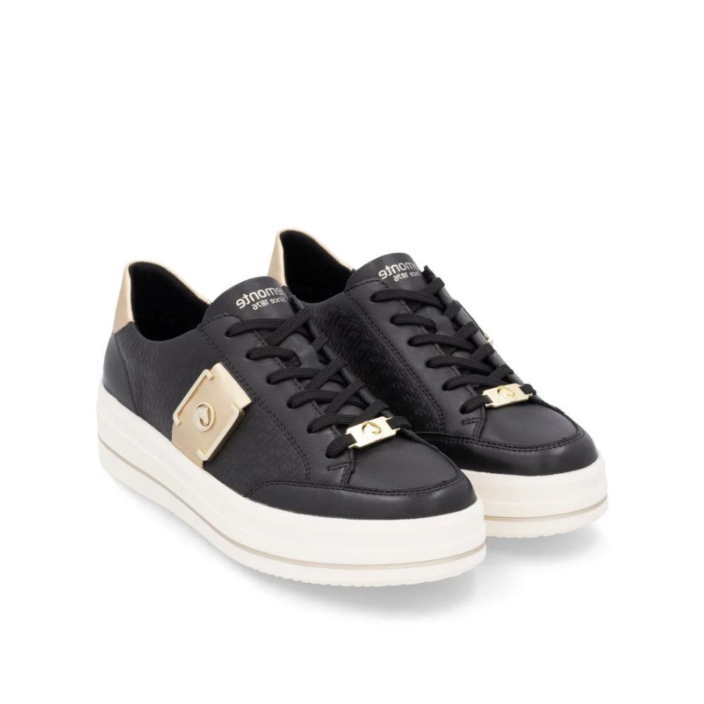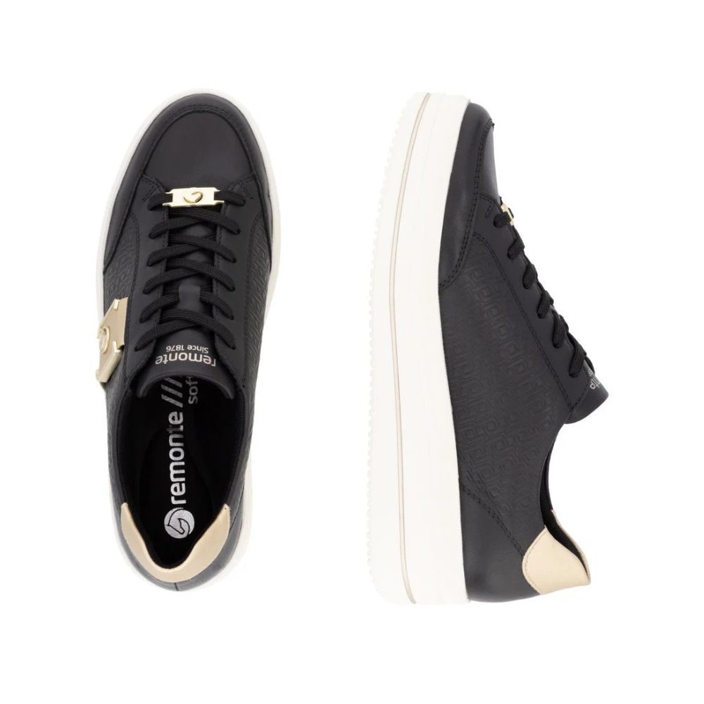 Voici un modèle pour les amoureuses du noir ! Ces baskets basses Remonte noir et or en cuir lisse feront battre le cœur des femmes soucieuses de la mode. De plus, le laçage garantit un maintien idéal et un ajustement parfait. La technologie Lite 'n Soft, avec sa semelle ultra-douce et sa semelle intérieure rembourrée et amovible, assure un confort optimal. Ce modèle est également disponible jusqu'à la pointure 45 et est coupé en largeur confort. La doublure intérieure en microvelours respirant offre un confort longue durée. Un compagnon idéal pour les beaux jours !