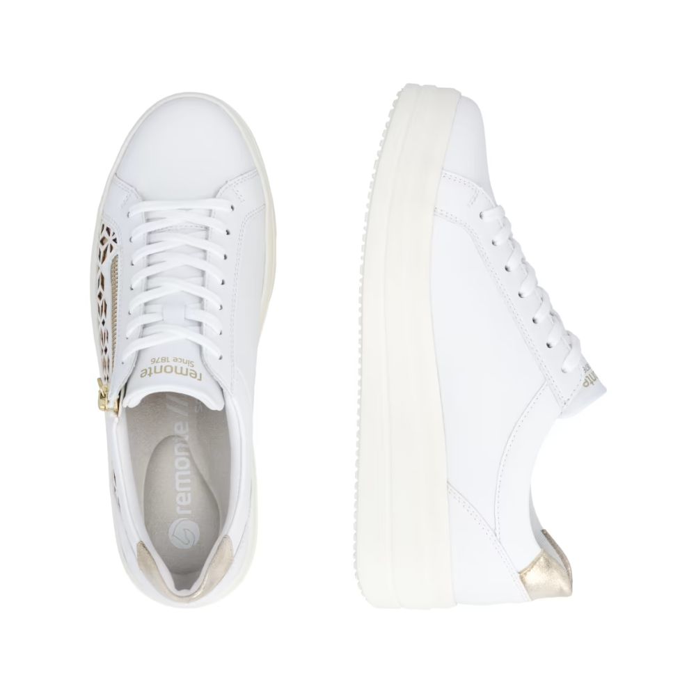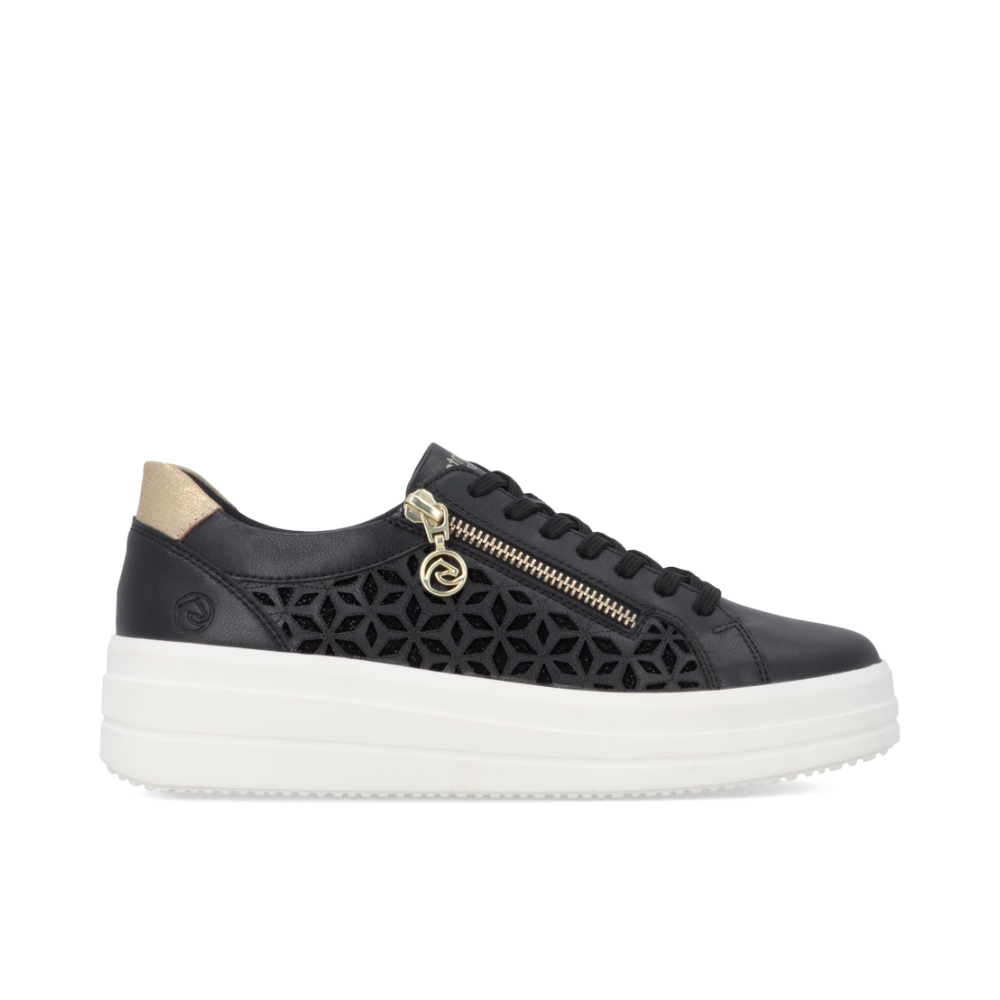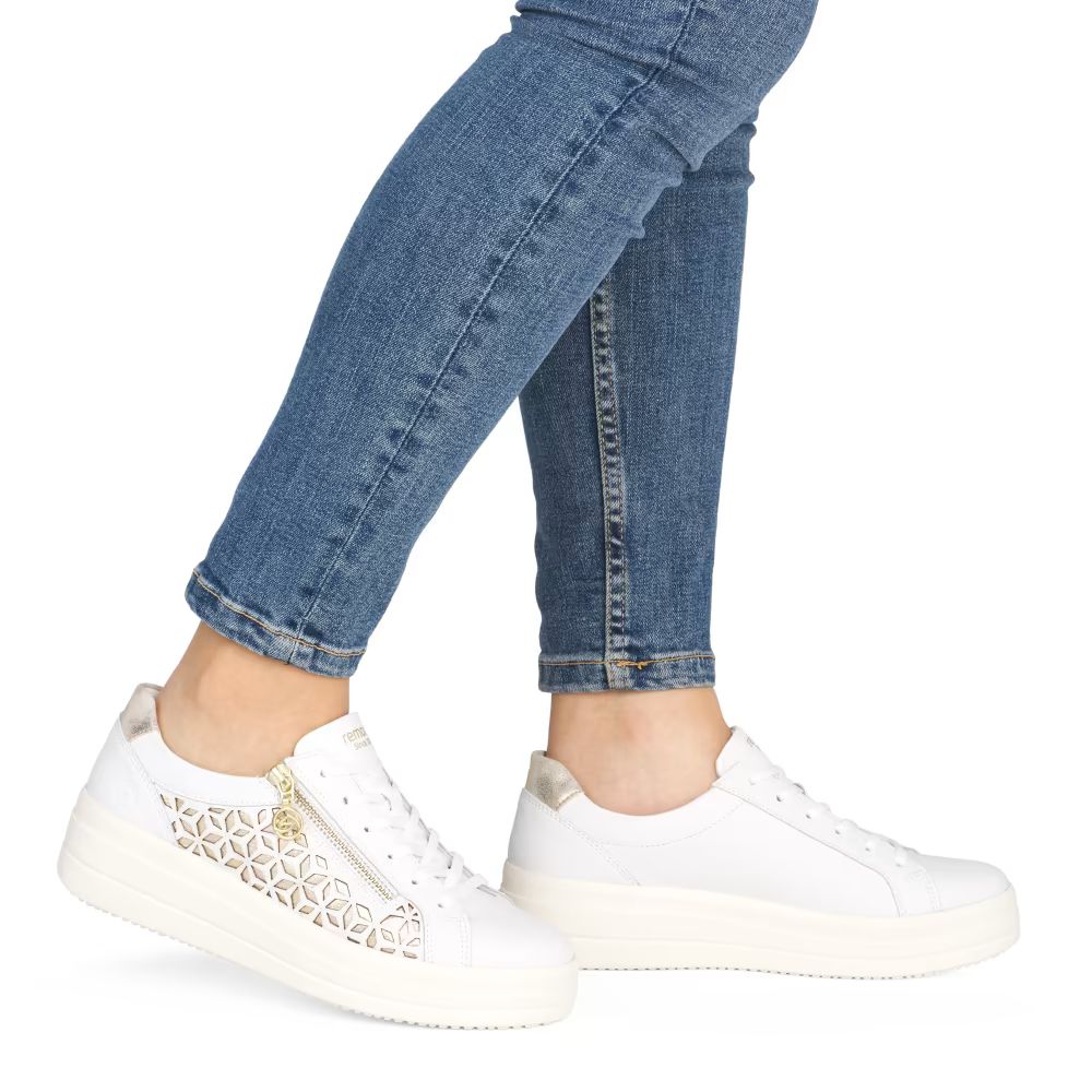 Ces baskets offrent une combinaison parfaite de style moderne et de confort optimal, devenant ainsi vos alliées préférées au quotidien. Au premier regard, elles séduisent par leur motif perforé sur les côtés et les subtils reflets dorés, une association qui leur confère un look original et un charme indéniable. L'enfilage est extrêmement facile grâce à la fermeture éclair pratique située sur le cou-de-pied, permettant un enfilage rapide, tandis que le laçage offre un ajustement précis à la morphologie du pied. La semelle intérieure souple, préformée et amovible, ainsi que la semelle extérieure haute et stable, garantissent un confort optimal tout au long de la journée.