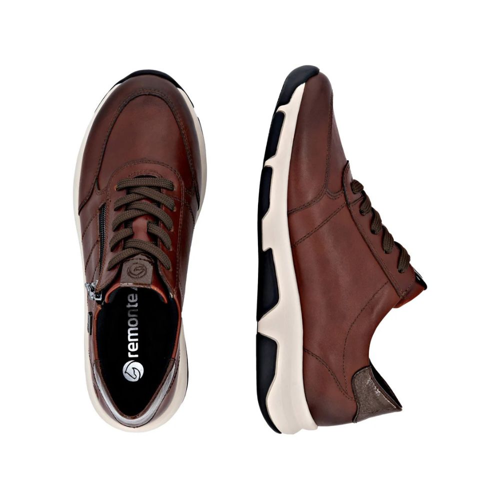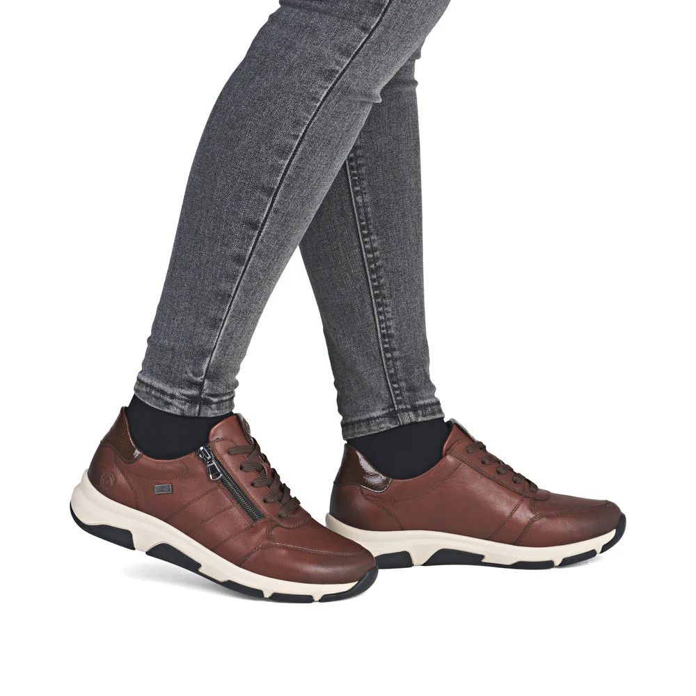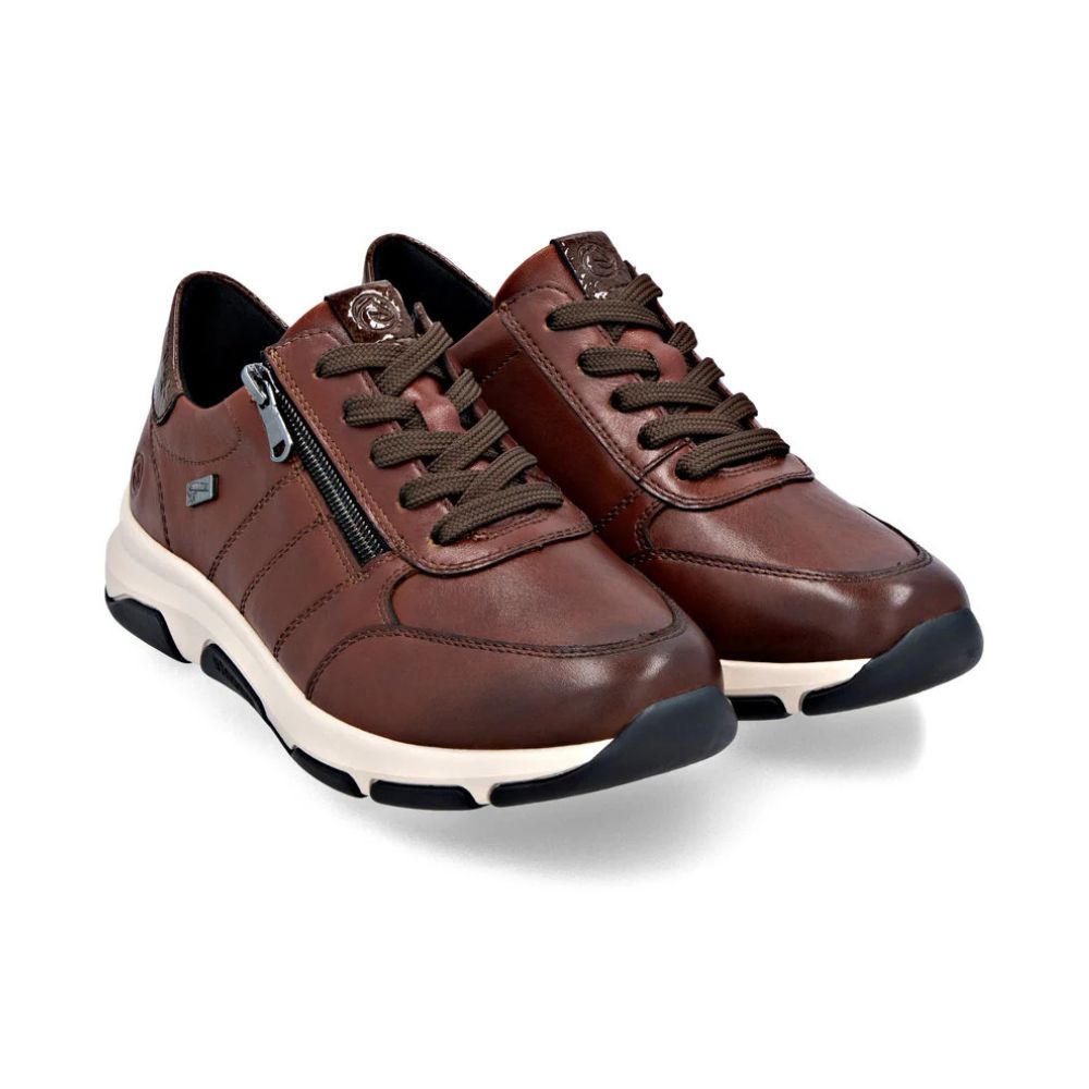 Ces baskets basses Remontée en cuir lisse respirent l'assurance féminine. L'ingénieux système de laçage et de fermeture éclair garantit un ajustement parfait et un maintien optimal. La semelle intérieure rembourrée et amovible ainsi que la semelle extérieure adhérente et légère sont des atouts supplémentaires. La largeur confortable offre suffisamment d'espace pour que les pieds se sentent à l'aise même après une utilisation prolongée. Ce modèle est déperlant grâce à la technologie RemontéeTEX. Le confort absolu !