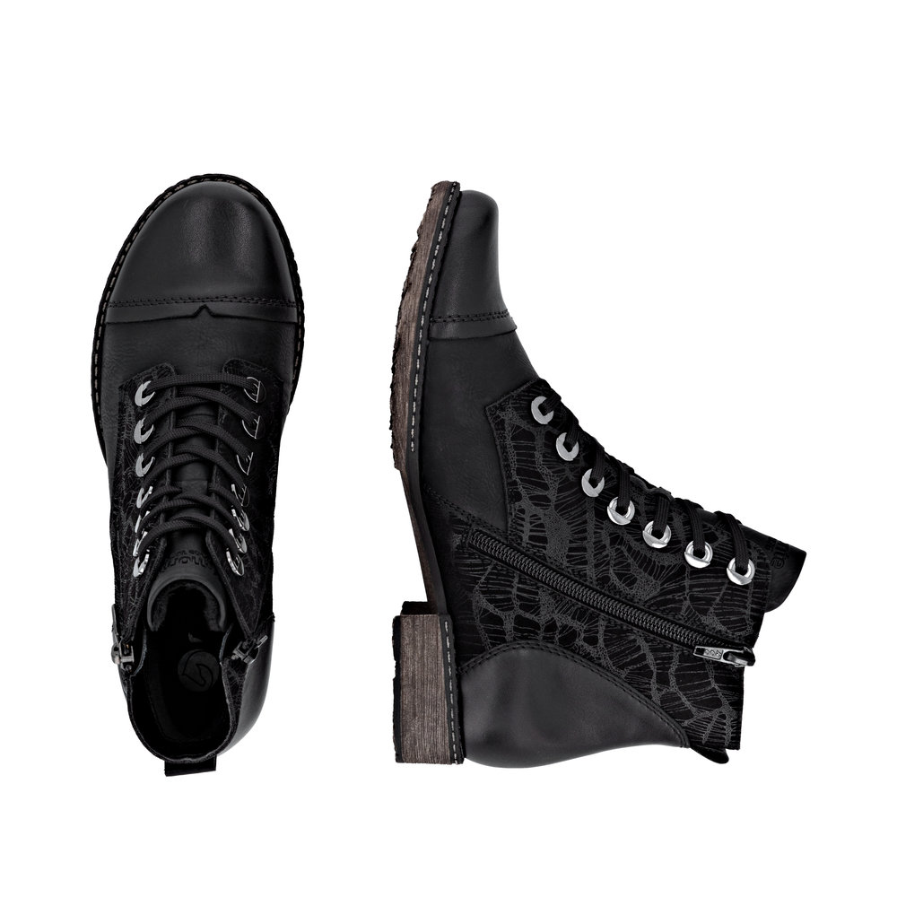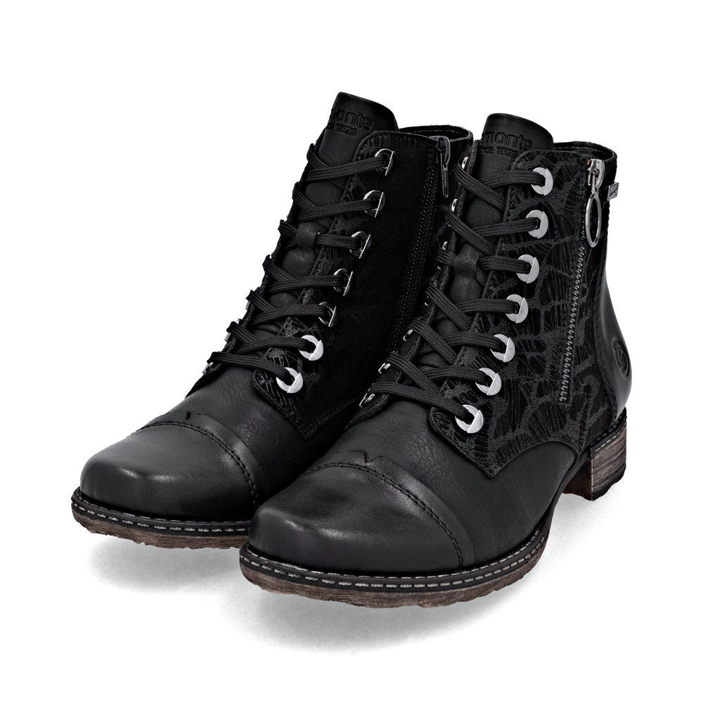 Le plein de style ! Ces bottines noires à lacets Remonte ont tout pour plaire. Le laçage et la fermeture éclair complètent à merveille fonctionnalité et confort. La semelle intérieure amovible et la semelle résistante à l'usure et adhérente sont des atouts majeurs. Ce modèle est coupé en largeur confort. Grâce à la technologie remonteTEX, la chaussure est déperlante et protège du vent. De quoi flâner sans souci !