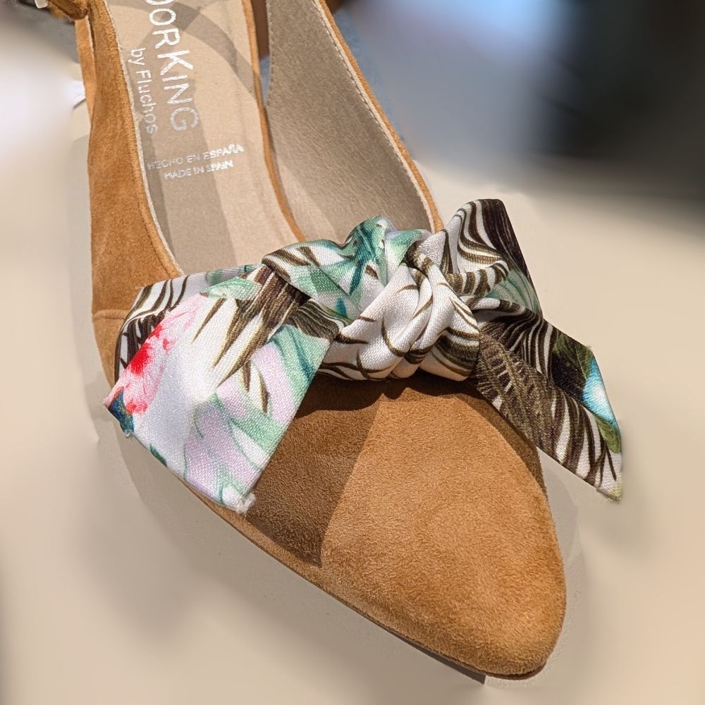 Soulier Dorking au style féminin et raffiné. Ce modèle slingback en suède camel présente un bout fermé et pointu, sublimé par un nœud décoratif imprimé qui apporte une touche d’originalité. La bride arrière ajustable et le talon élégant et confortable en font un choix idéal pour un look chic et facile à porter au quotidien.