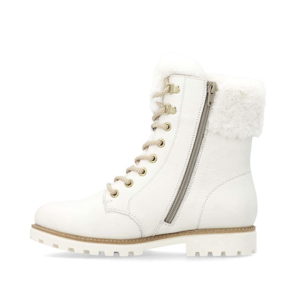 Les journées froides deviennent chaudes ! Ces bottines blanches Remonte à lacets en cuir lisse sont un véritable accroche-regard ! L'association astucieuse du laçage et de la fermeture éclair facilite l'enfilage et le retrait. Le col de la tige effet peluche est un détail appréciable. La semelle amortissante et flexible assure un bon maintien. La largeur confort offre plus d'espace aux pieds. La surface déperlante offre une protection optimale contre les intempéries et la semelle intérieure thermique protège du froid. Grâce à la fourrure d'agneau agréablement chaude et régulatrice d'humidité, cette chaussure est parfaite pour les températures froides. Difficile de faire plus confortable !