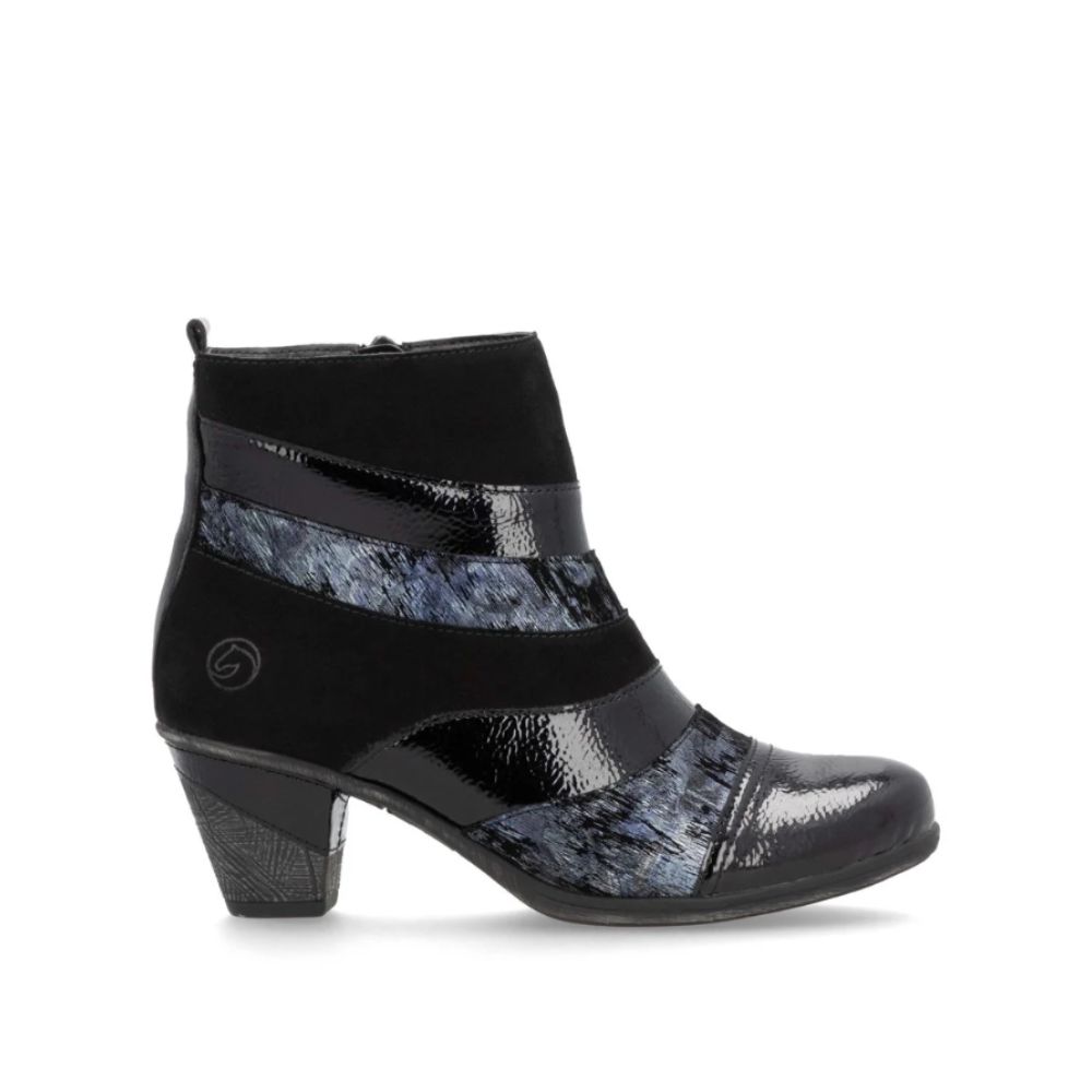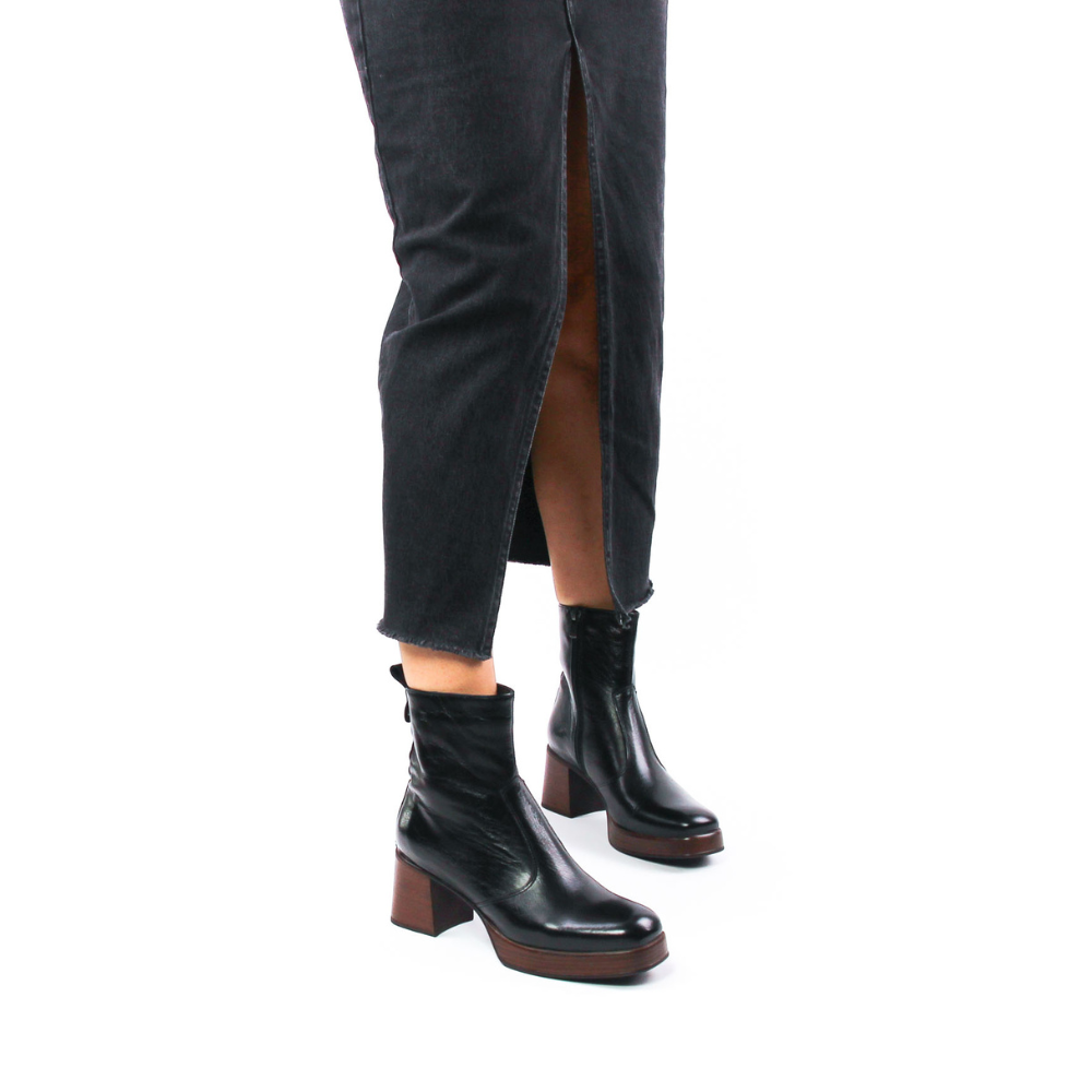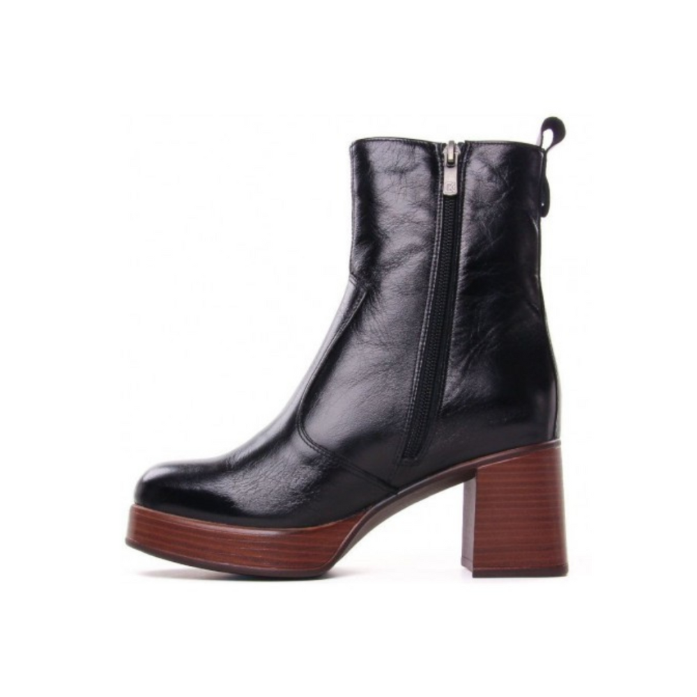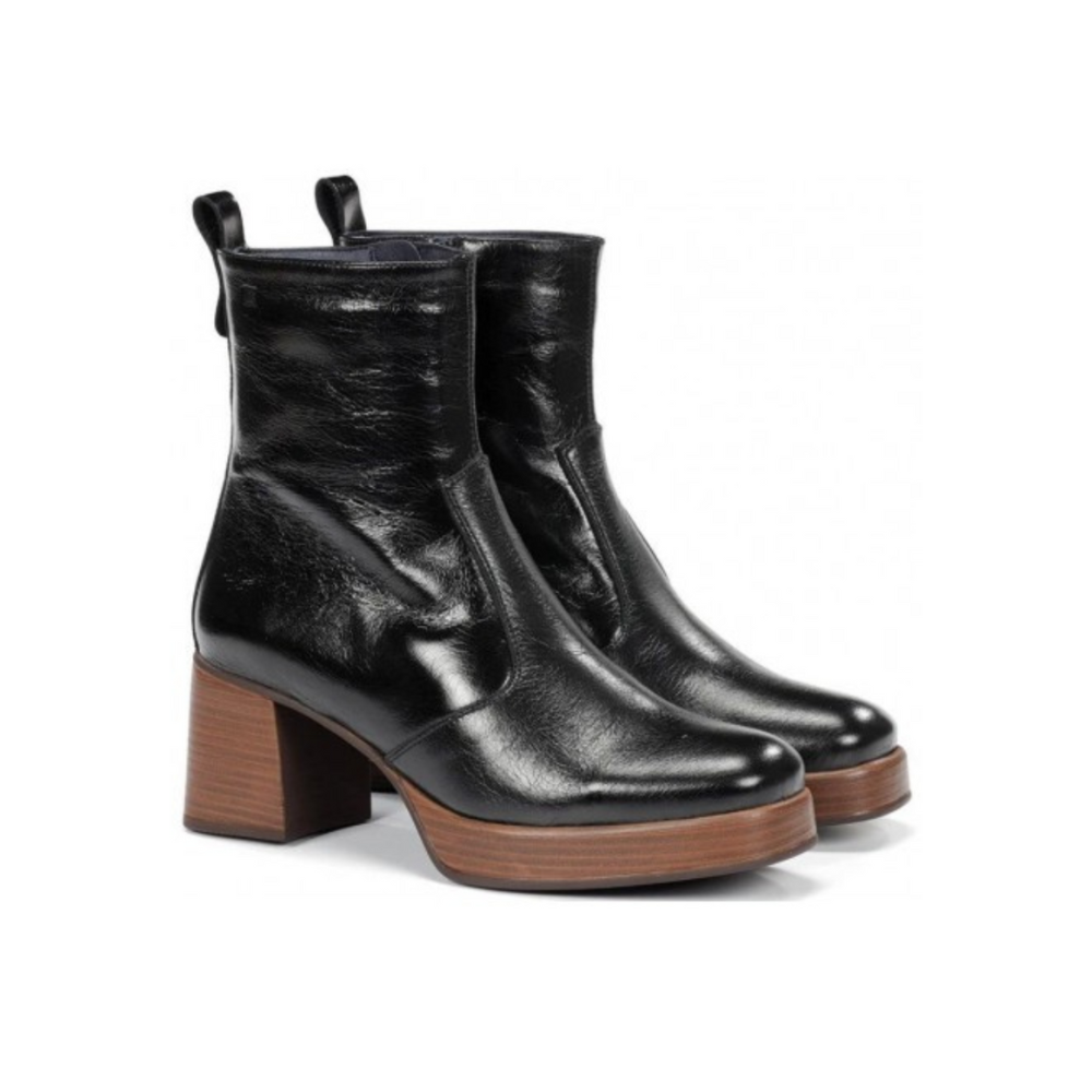 Boots à talons de la marque Dorking de couleurs noires. Un tige haute glacée en cuir effet vieilli, bottines au style chic et citadin, un talon bloc haut de 7 cm, une semelle épaisse plateforme marron, une fermeture éclair pour une chausse aisée, boots élégantes et confortables signées par la marque espagnole Dorking nouvelle collection hiver.