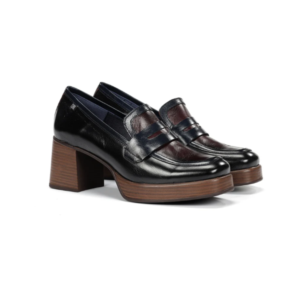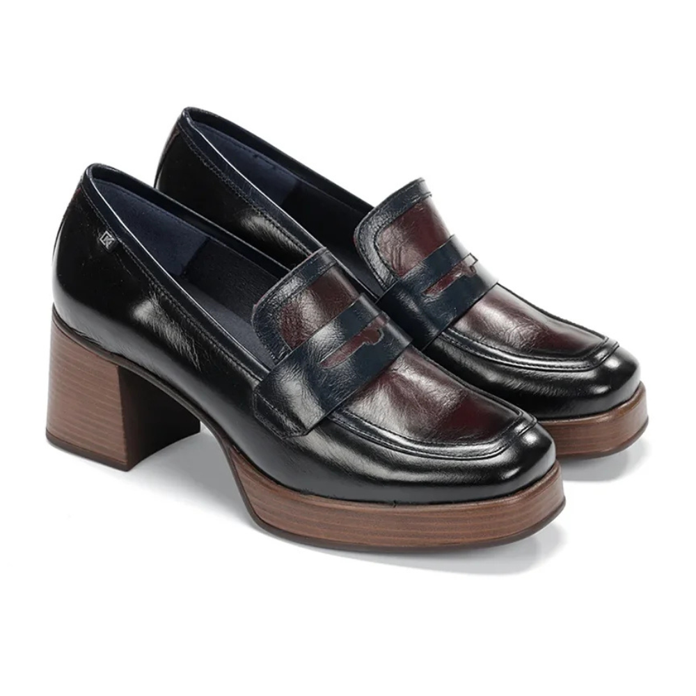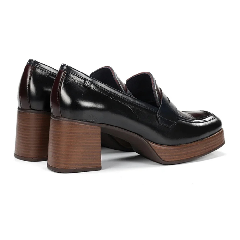 Mocassins Trotteurs de la marque Dorking de couleur noire. Un tige glacée en cuir effet vieilli, mocassins à talon haut massif de 7 cm, une tige marron cognac pour cette nouvelle collection 2024, sur un plateau effet bois de 3 cm de hauteur, un style chic et citadin, hauts trotteurs élégants et confortables signées par la marque espagnole Dorking.
