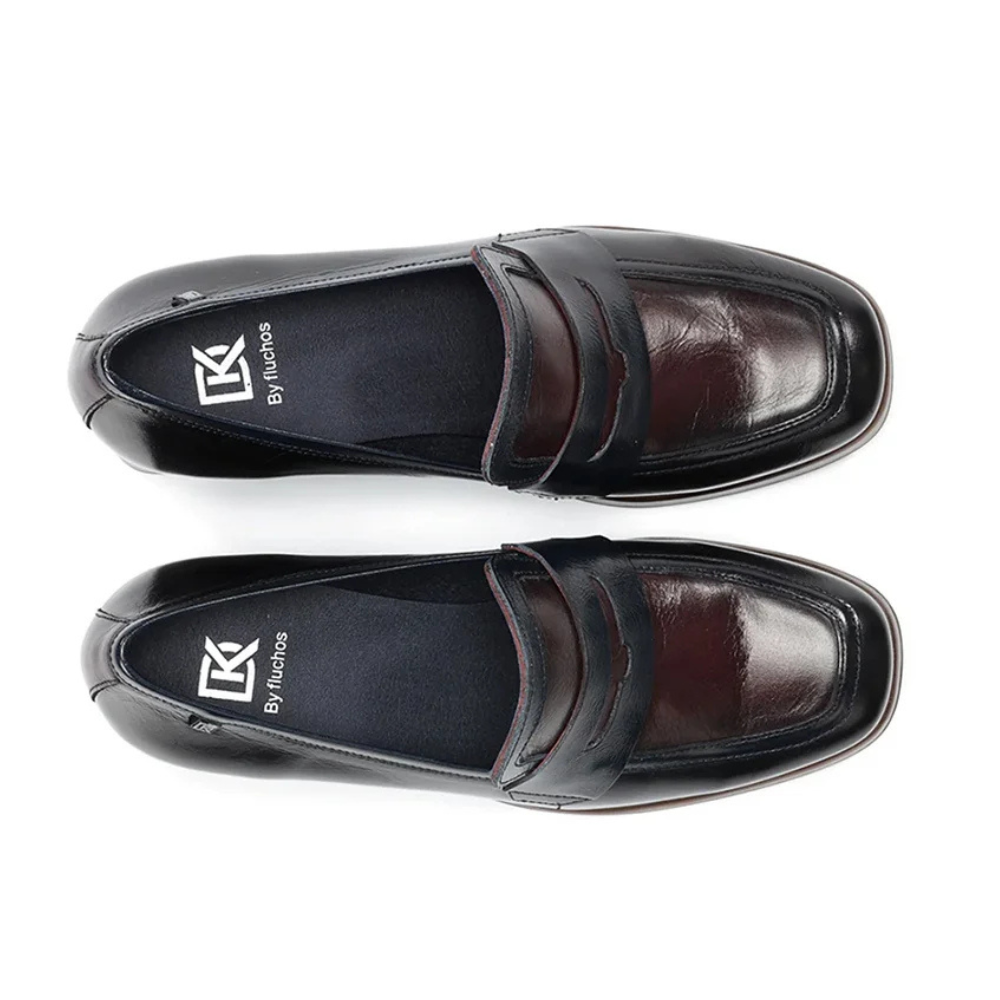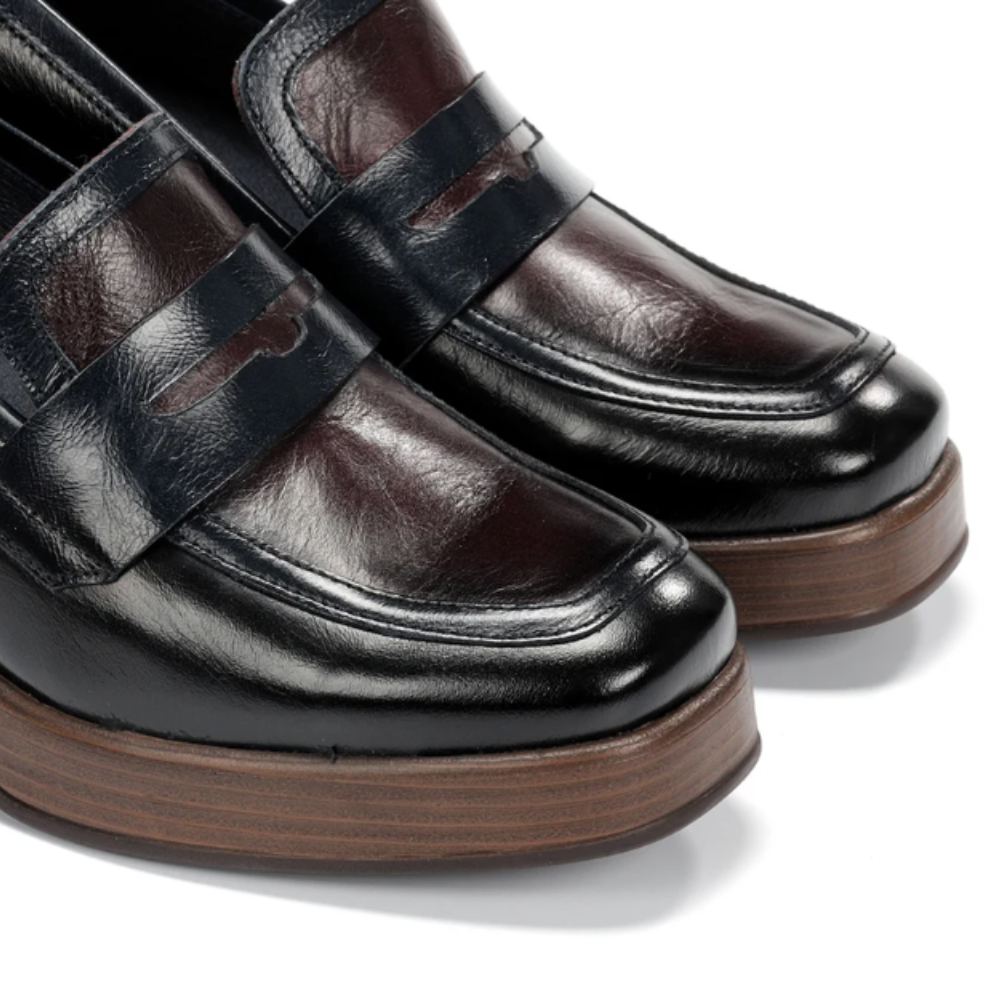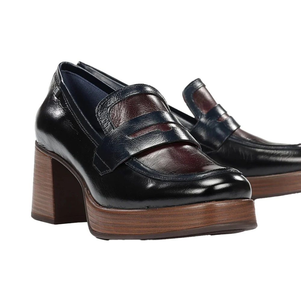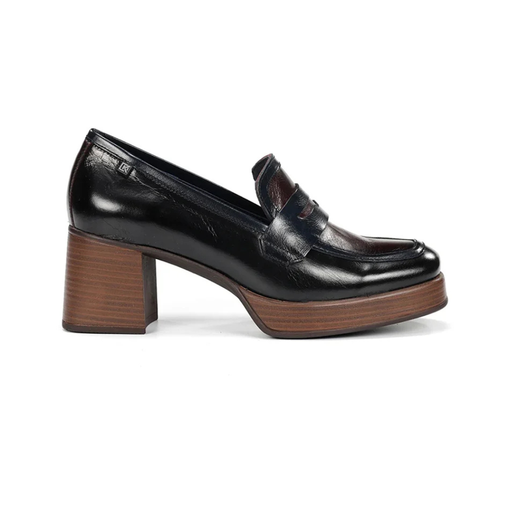 Mocassins Trotteurs de la marque Dorking de couleur noire. Un tige glacée en cuir effet vieilli, mocassins à talon haut massif de 7 cm, une tige marron cognac pour cette nouvelle collection 2024, sur un plateau effet bois de 3 cm de hauteur, un style chic et citadin, hauts trotteurs élégants et confortables signées par la marque espagnole Dorking.