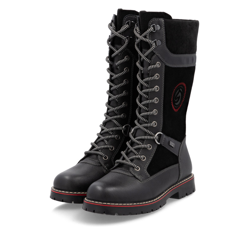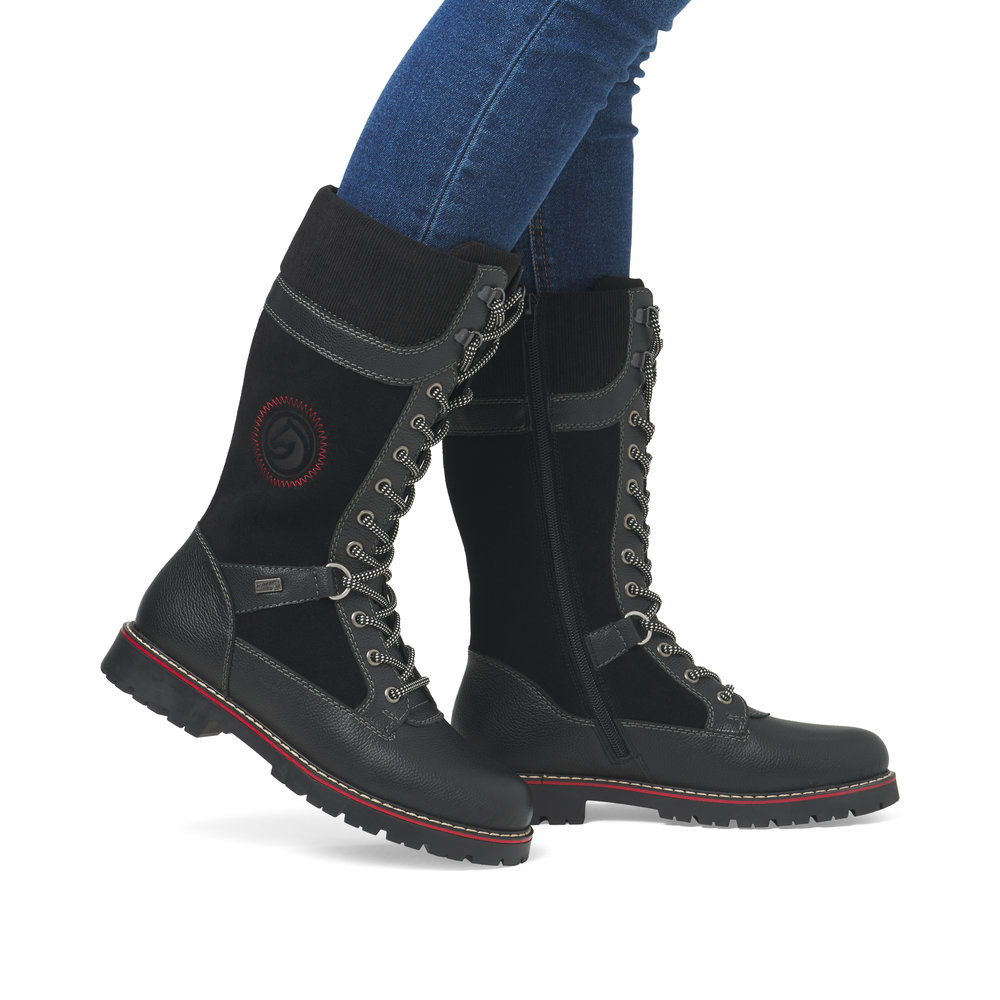 Pas de compromis ! Ces bottes hautes noires Remonte en daim séduiront les femmes soucieuses de la mode grâce à leurs atouts. L'association astucieuse du laçage et de la fermeture éclair facilite l'enfilage et le retrait. La semelle souple et adhérente assure une bonne adhérence en toutes circonstances. De plus, la largeur confort offre une plus grande liberté de mouvement à l'avant-pied. Ce modèle allie fonctionnalité et fonctionnalité : la membrane déperlante garde les pieds au sec, les crampons rabattables offrent une meilleure adhérence sur les sols glacés et la semelle intérieure thermo-isolante protège du froid. La laine vierge douillette et très chaude garde les pieds au chaud. Profitez des journées froides !