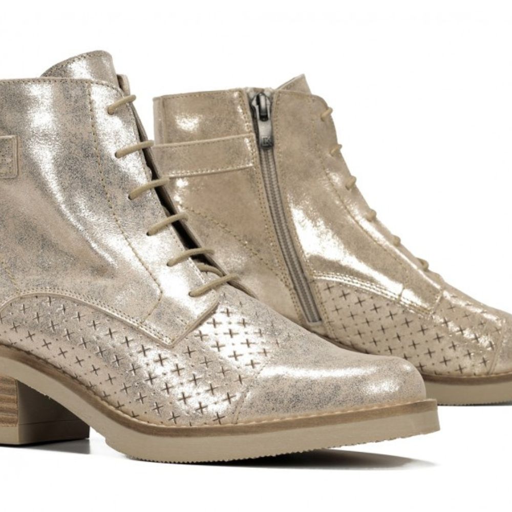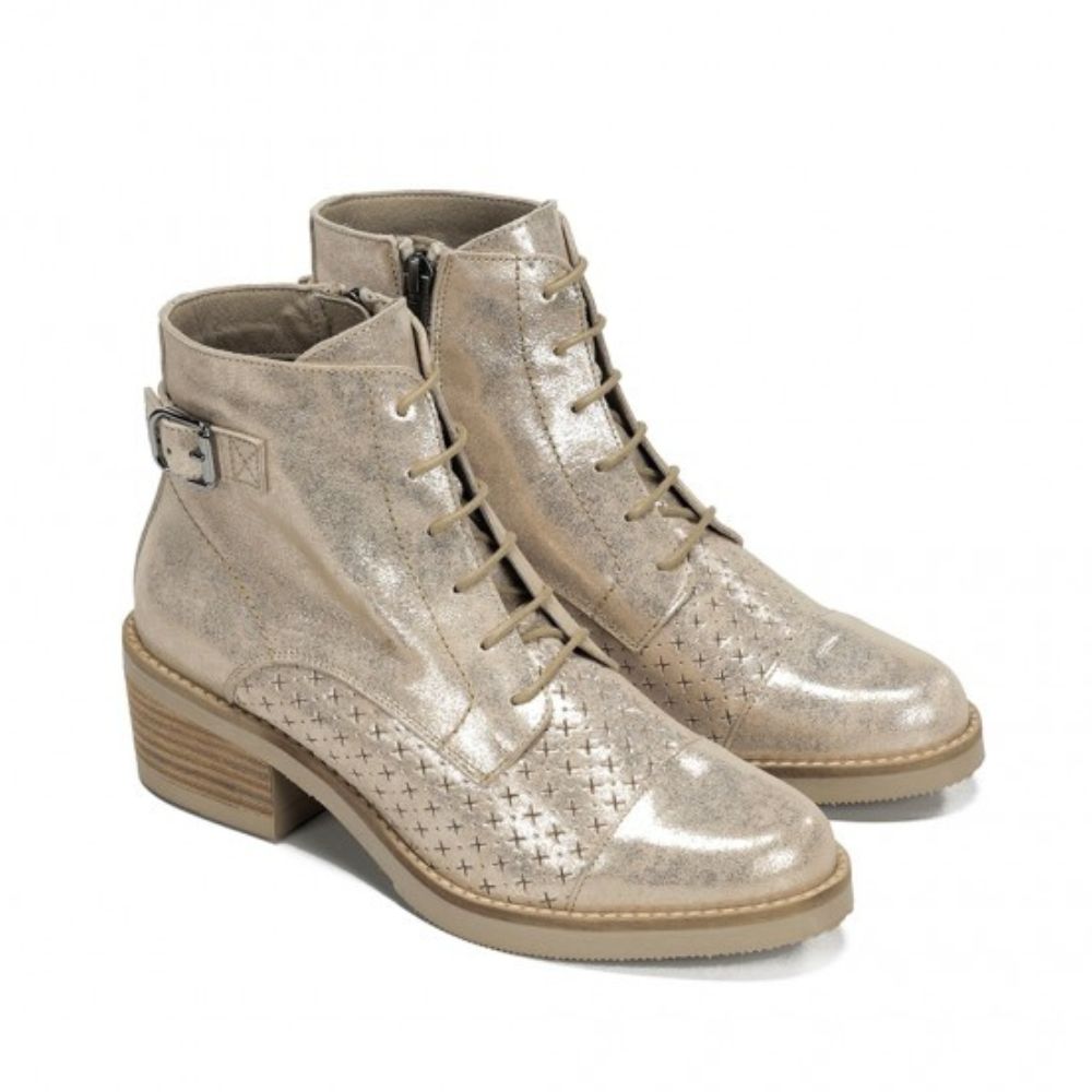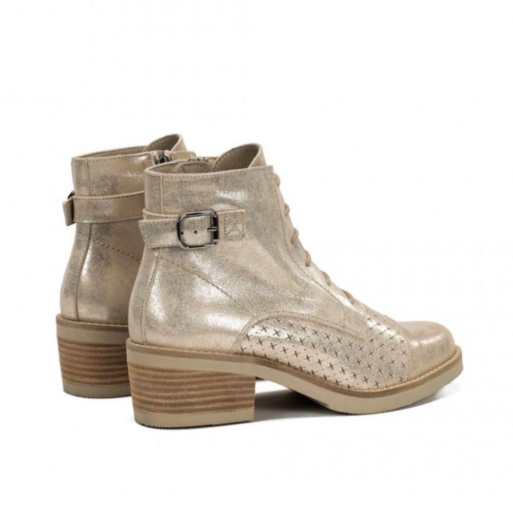 Dotées de lacets et d’un zip latéral pour un enfilage facile, elles présentent un bout arrondi avec des perforations décoratives qui ajoutent du caractère. Le talon épais effet bois assure stabilité et confort, tandis qu’une bride à boucle complète leur design moderne.