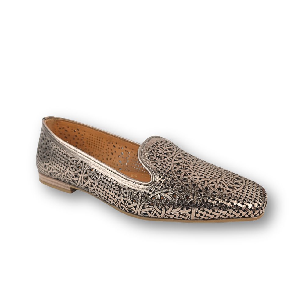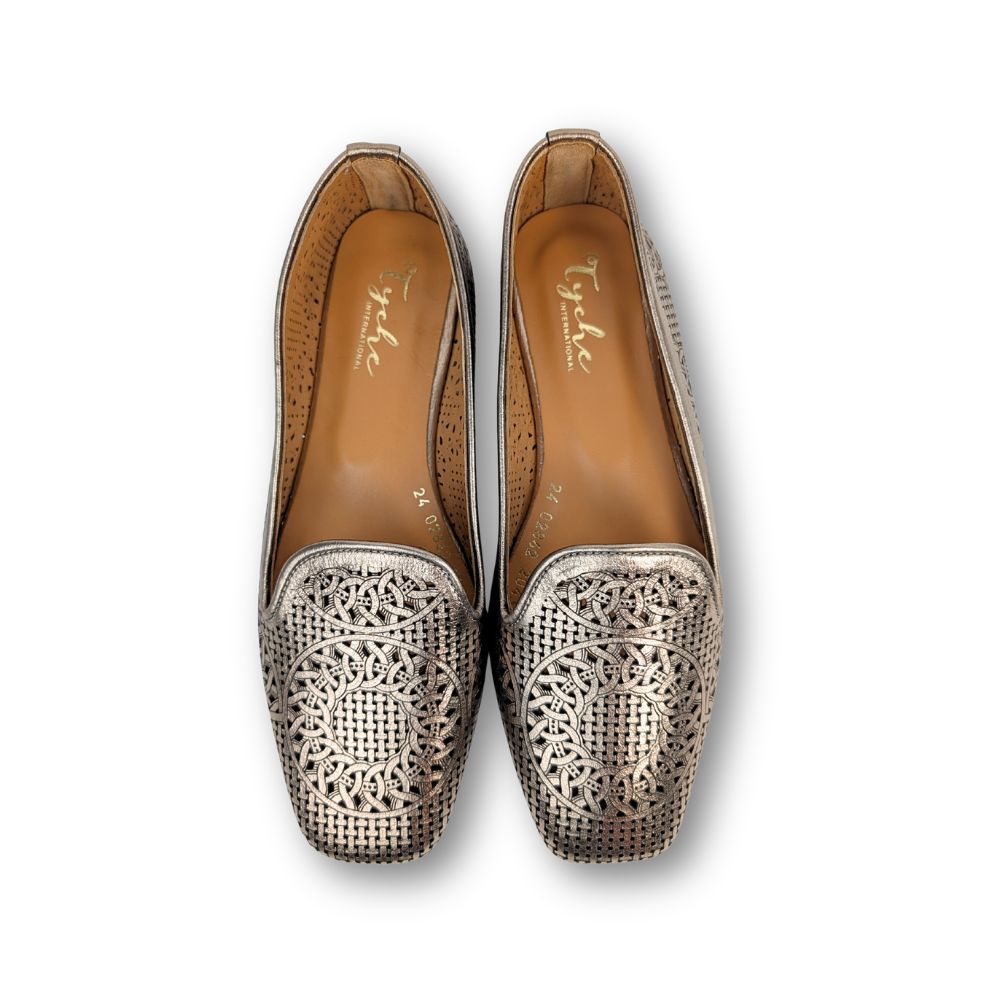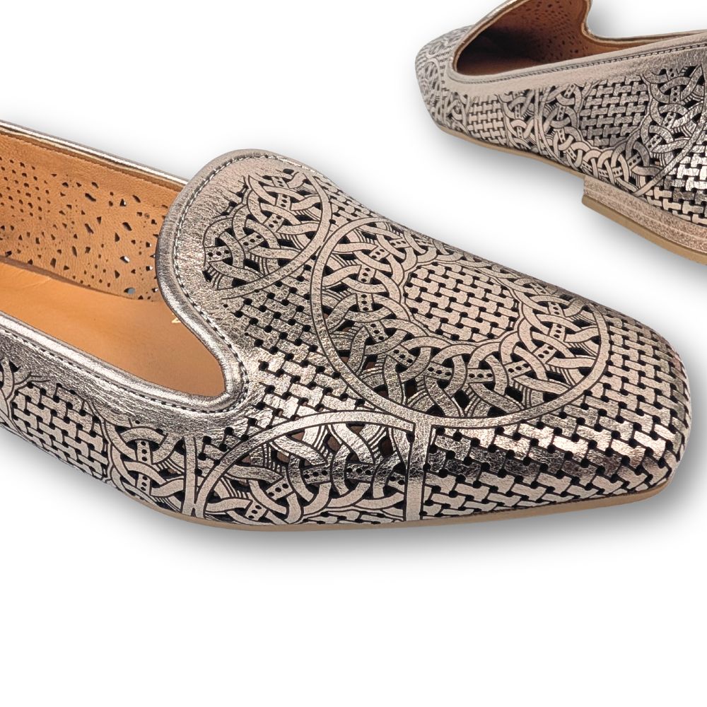 Confectionnée en cuir véritable, cette ballerine raffinée séduit par son motif ajouré délicatement travaillé, qui apporte une touche d’originalité tout en laissant respirer le pied. Sa finition métallisée aux reflets sophistiqués capte la lumière et sublime chacune de vos tenues, du quotidien aux occasions spéciales.