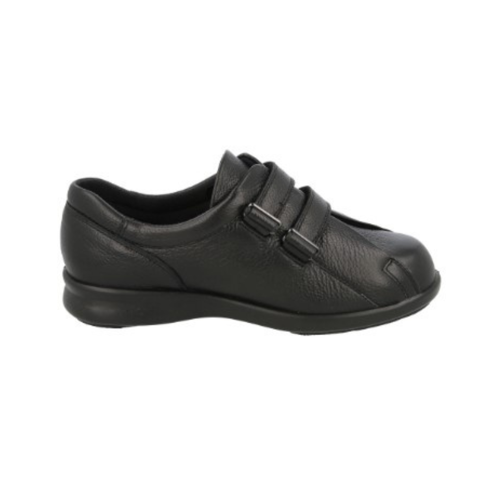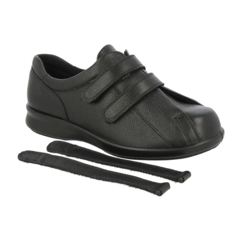 Chaussure adaptée Exmoore de Easy B de couleur noire, idéale pour pieds très enflés grâce à sa grande ouverture. Elle offre un ajustement plus large et plus profond, est confortable et convient aux orthèses. Fermée par deux sangles pour un enfilage rapide et facile, elle dispose également d'une semelle amortissante.