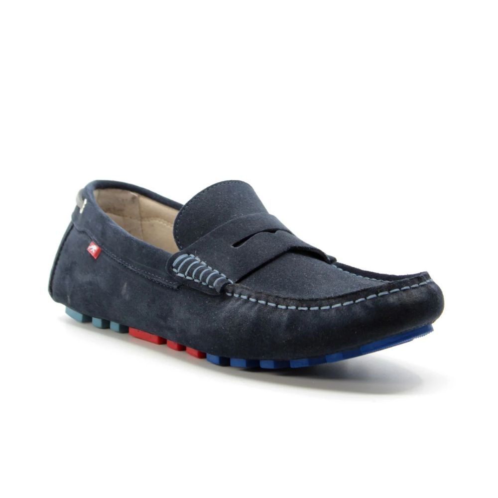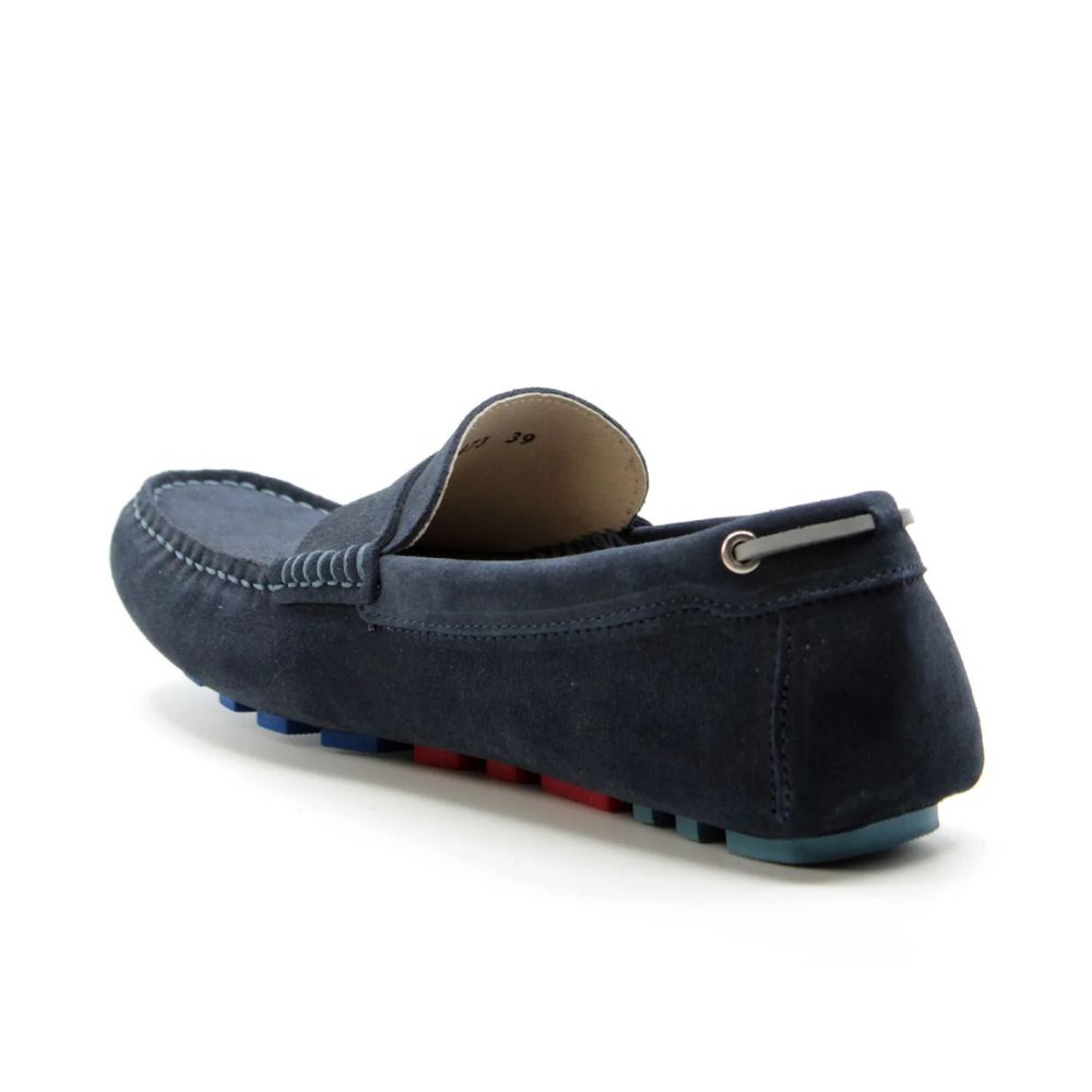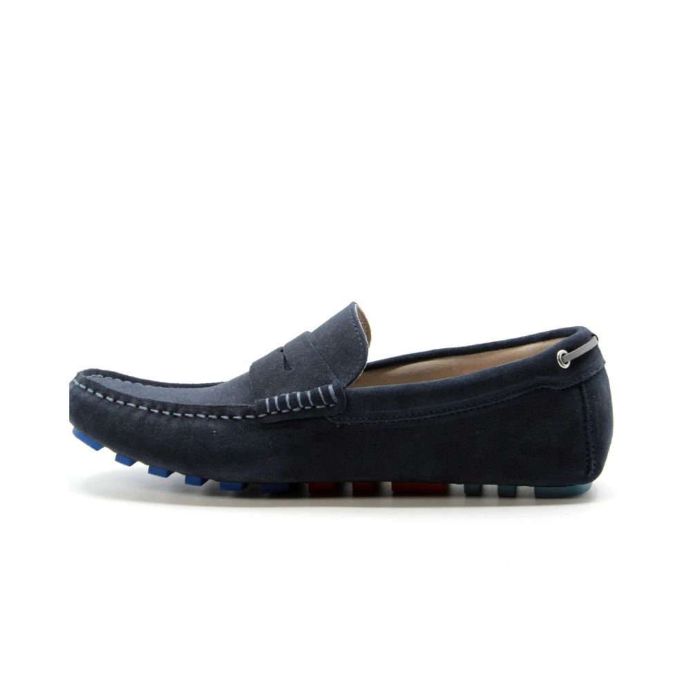 Mocassin en daim bleu, confectionné en cuir de première qualité, tanné et assoupli par centrifugation. Ce procédé confère à la chaussure un confort et une respirabilité exceptionnels, notamment grâce à l'utilisation de cires naturelles pour la finition de la couleur.