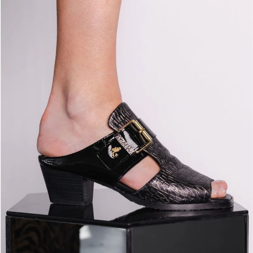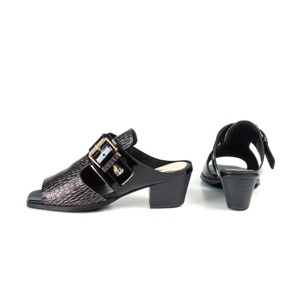 Cette sandale se distingue par son embossé, sa grosse boucle et ses détails vernis rendant votre jambe très élégante. Vous sentirez le plus grand des conforts avec la semelle extra-coussinée et la devanture de cuir extensible. Mesdames aux pieds sensibles, découvrez votre nouvelle sandale favorite !