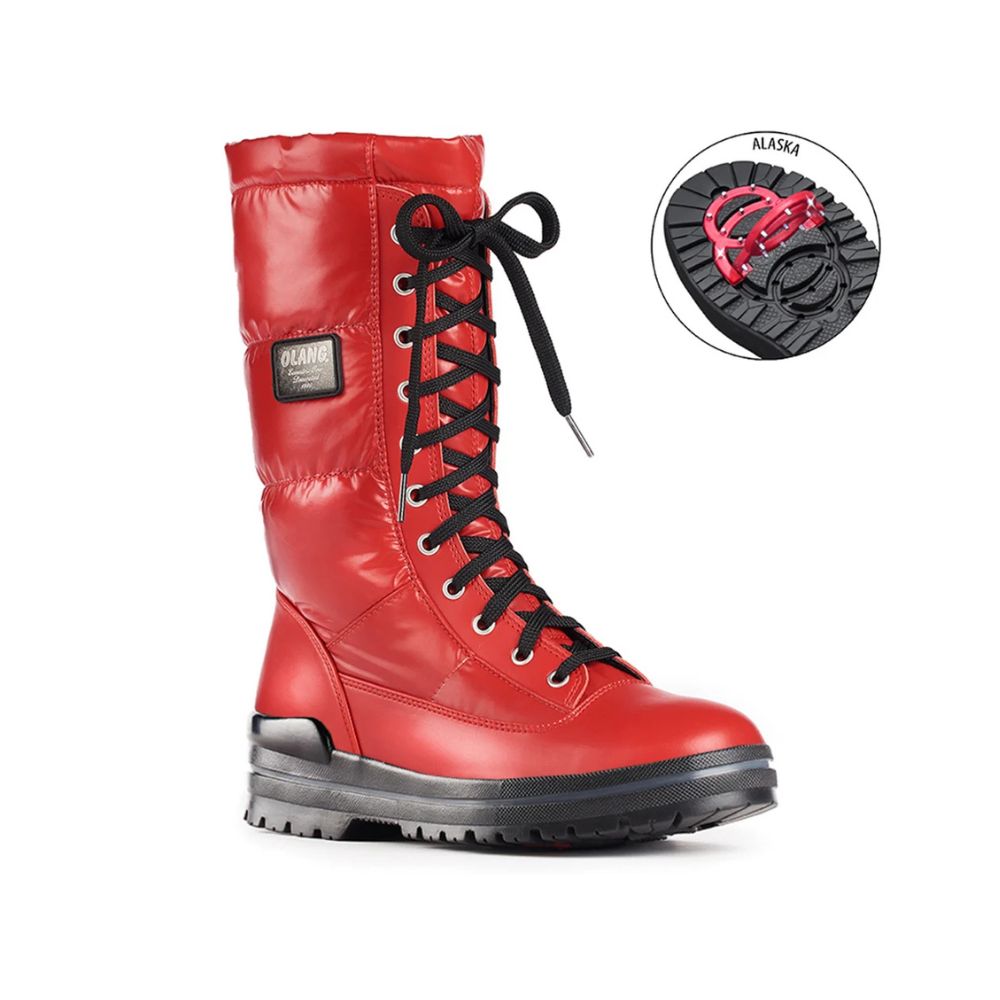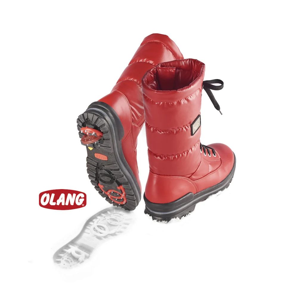 Elles sont équipées d’une semelle italienne haute performance, spécialement conçue pour améliorer l’adhérence sur la neige et la glace. La semelle ALASKA de OC System intègre un système exclusif de 16 crampons en acier inoxydable, pivotants et rabattables, avec canaux d’écoulement pour une meilleure stabilité. Les crampons sont montés sur un cadre en polyuréthane flexible, durable même à des températures extrêmes.