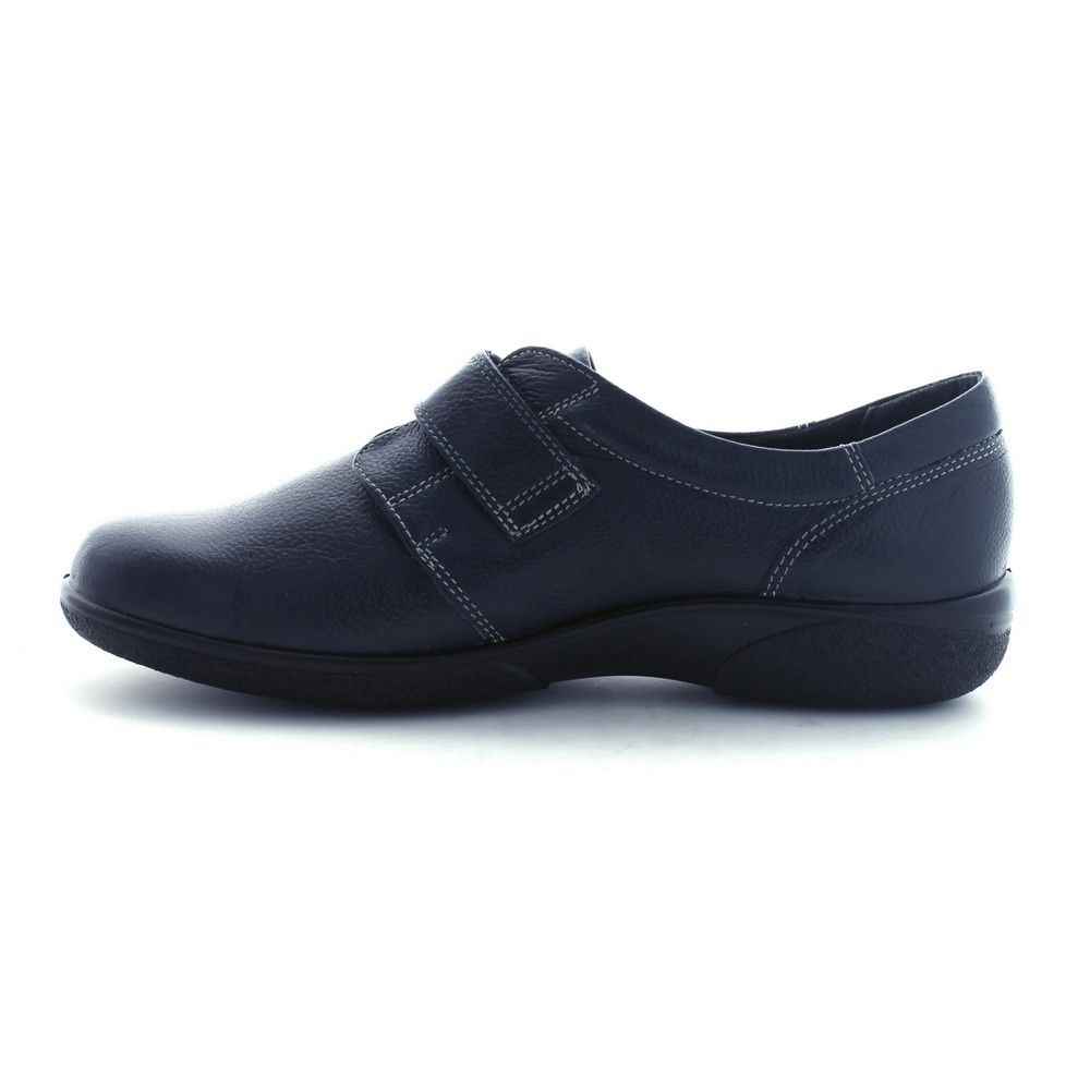 Chaussures en cuir pour femmes extra larges en cuir noir avec surpiqûres contrastées et fermeture velcro. Les semelles intérieures des chaussures peuvent être retirées si une profondeur supplémentaire est nécessaire. La semelle absorbant les chocs est extrêmement légère et flexible, ce qui la rend excellente pour un confort tout au long de la journée.