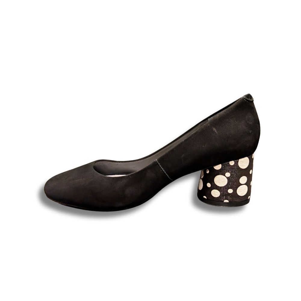 Cet escarpin noir de la marque Capelli Rossi séduit par son élégance intemporelle et la qualité de son cuir d’une douceur exceptionnelle. Habillé de suède noir raffiné, il se distingue par un talon original orné de pois blancs, apportant une touche de fantaisie subtile et chic. Un modèle unique, idéal pour rehausser une tenue avec style et caractère.