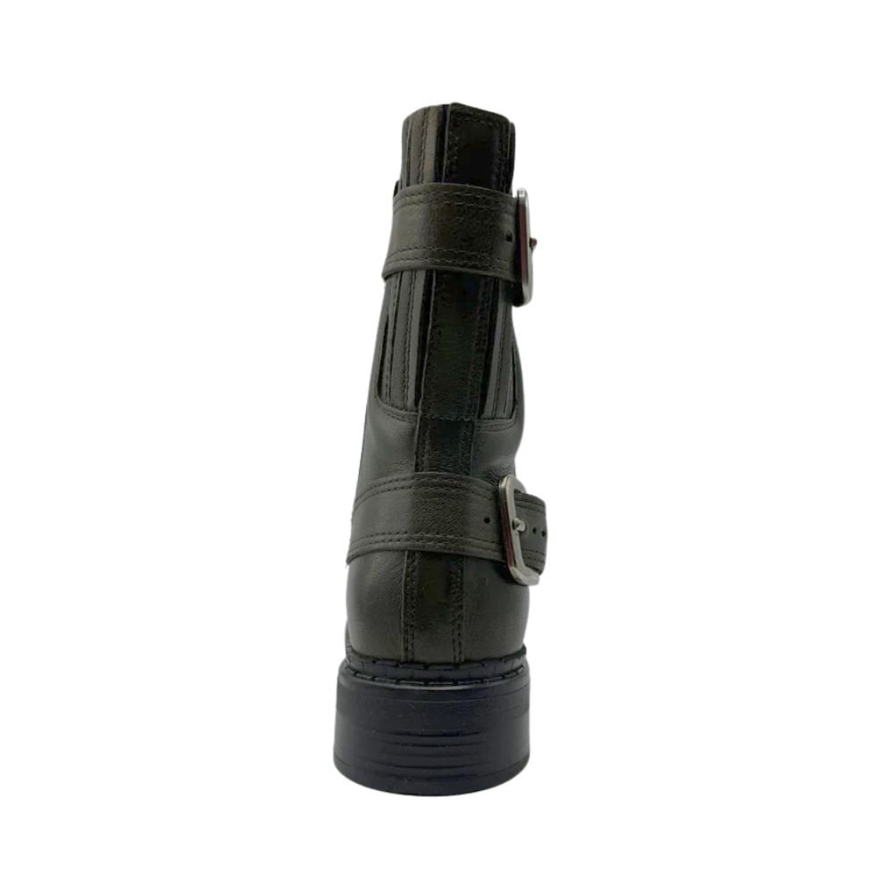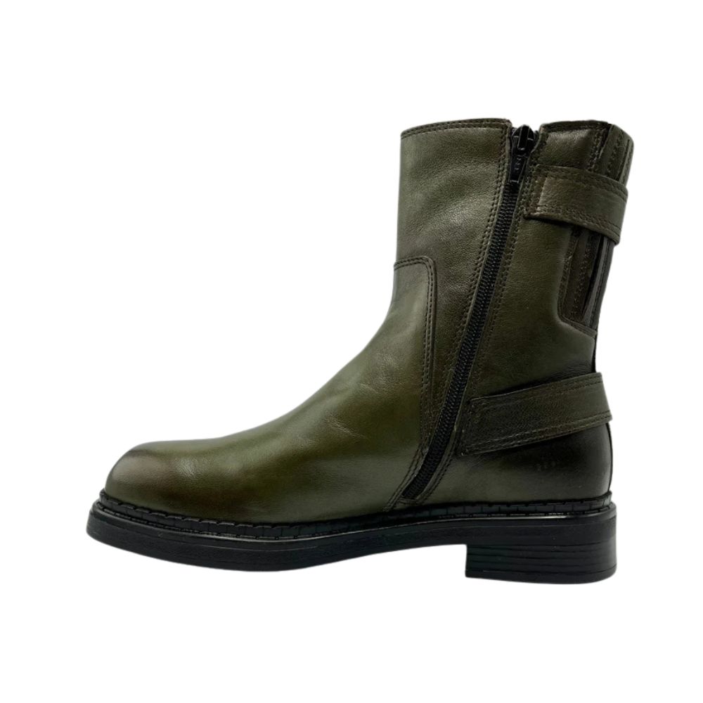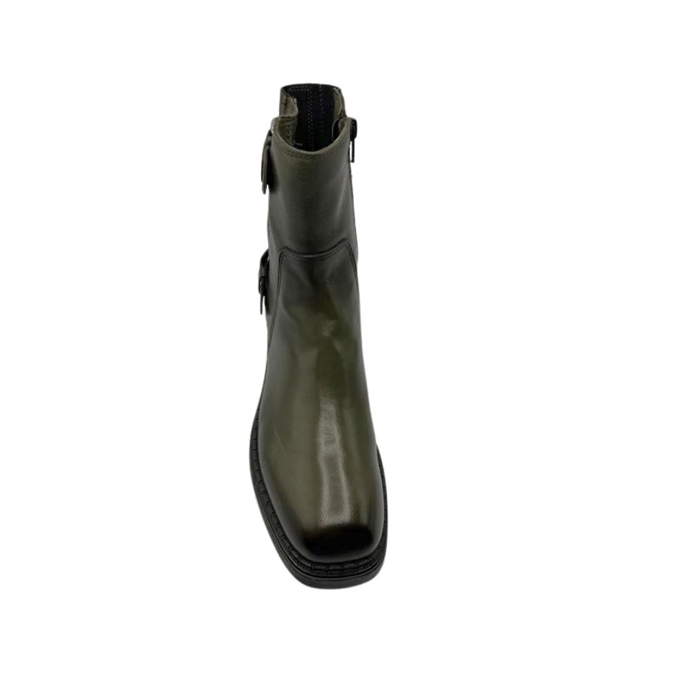 Confectionnée en cuir vert olive profond, la bottine moto Mjus Fata se distingue par ses grandes boucles argentées et sa fermeture éclair latérale pratique. Son petit talon bloc allie style et stabilité, ce qui en fait un choix raffiné pour celles et ceux qui recherchent une chaussure à la fois audacieuse et sophistiquée. Parfaite pour apporter une touche d'élégance et d'audace à votre garde-robe.