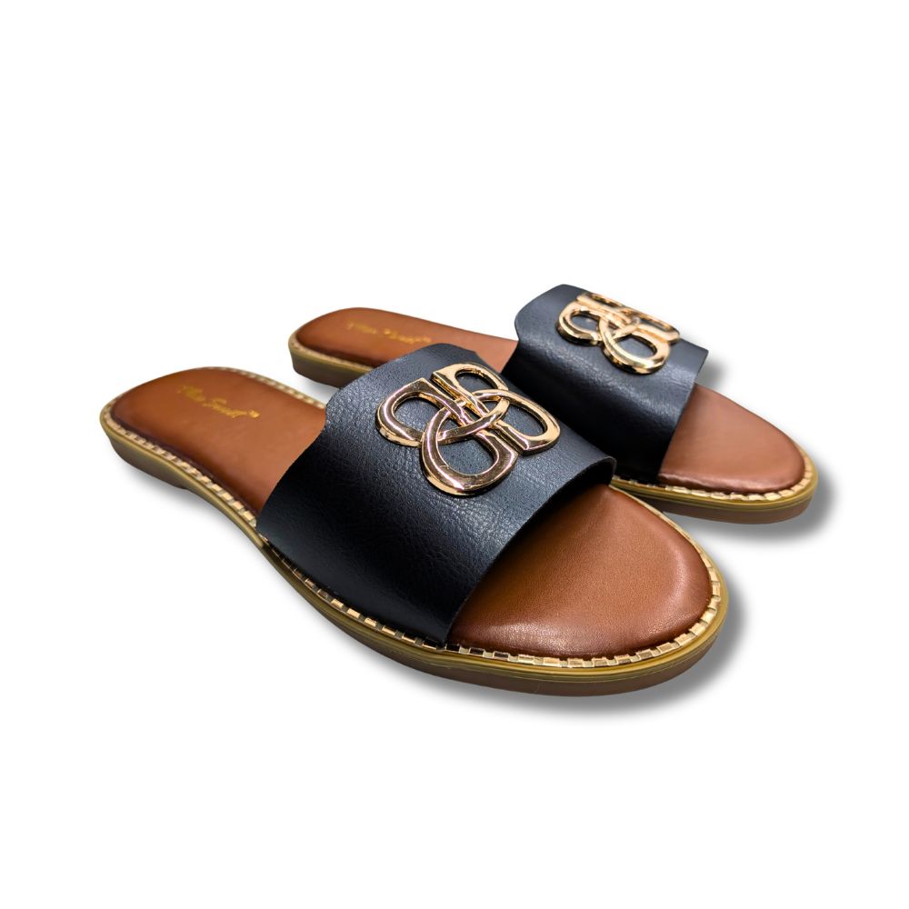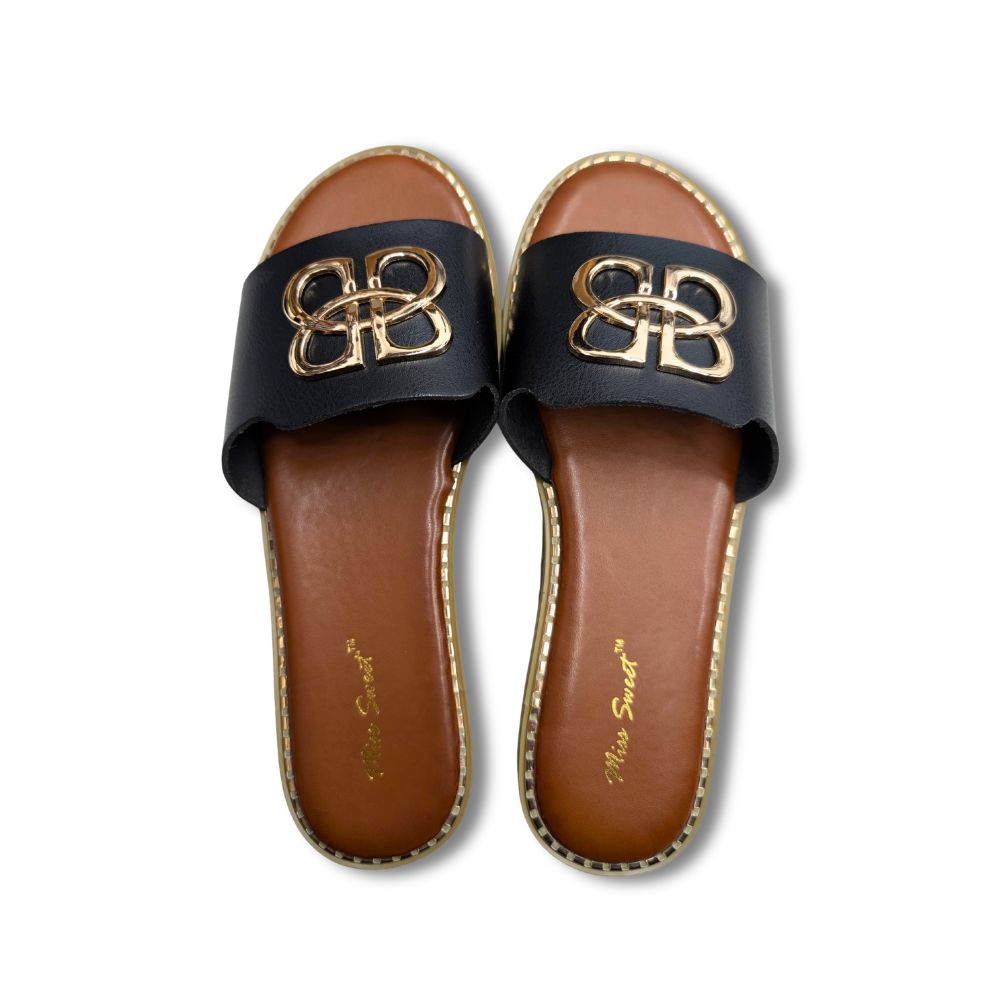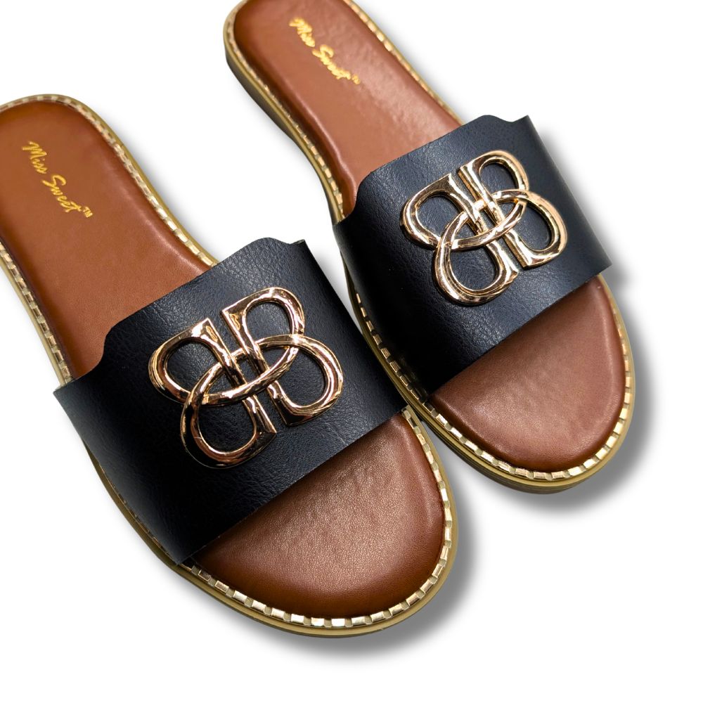 Sandale mule Miss Sweet au design chic et minimaliste, dotée d’une large bride noire effet cuir ornée d’un élégant détail métallique doré. Sa semelle plate marron assure un confort optimal au quotidien, idéale pour un look à la fois moderne et décontracté.