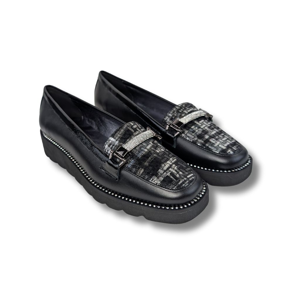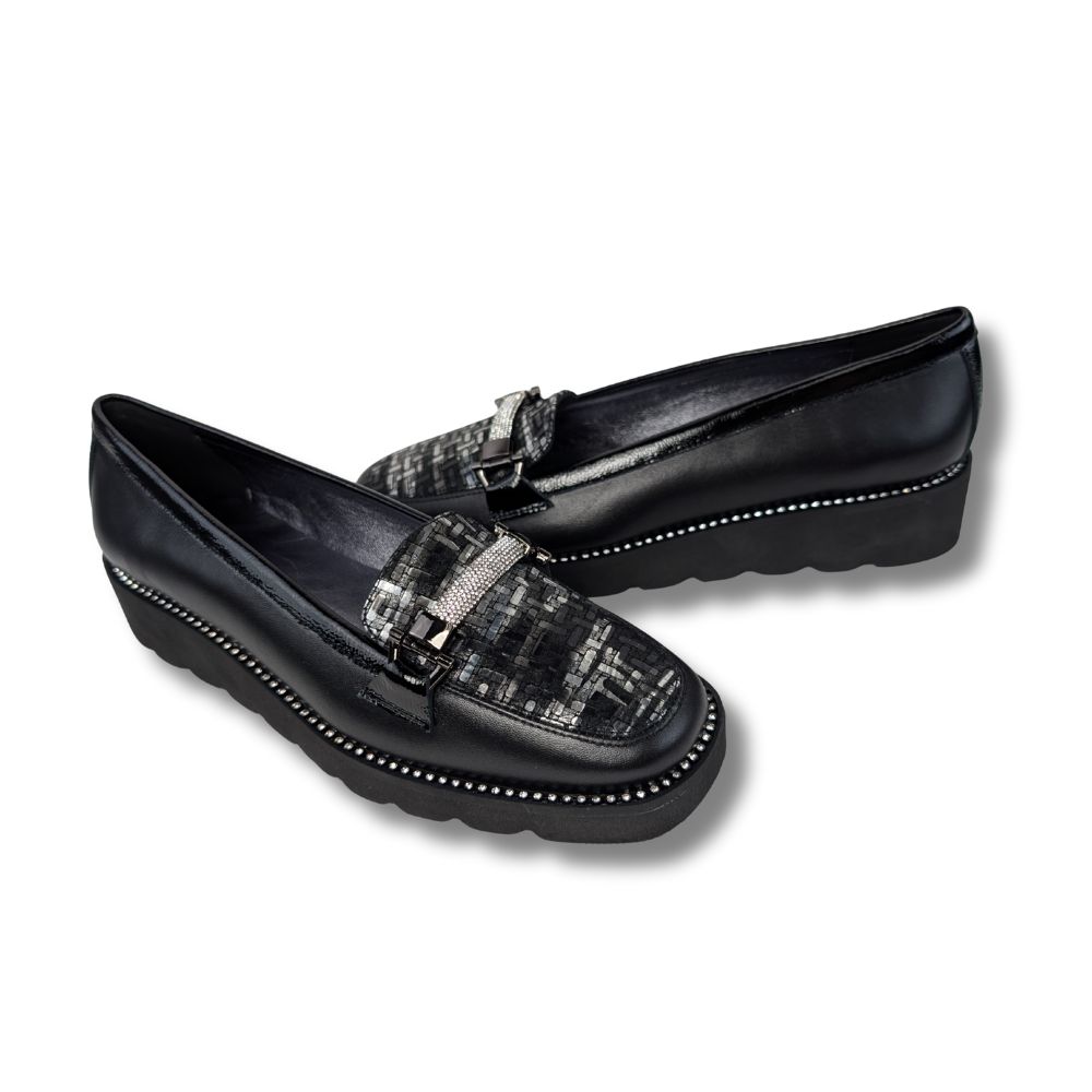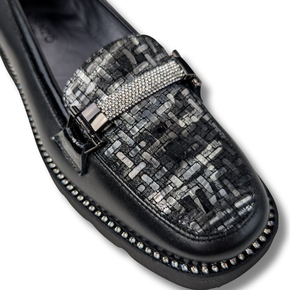 Chaussure Di Chenzo au style résolument chic, réalisée en cuir vernis noir sublimé par un motif argenté élégant. Des strass délicats apportent une touche lumineuse et sophistiquée, soulignant le raffinement du modèle. Une création élégante, idéale pour rehausser une tenue habillée avec modernité.
