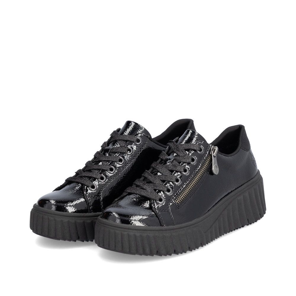 Confort et style se marient parfaitement. Ces baskets basses Rieker en cuir verni séduisent par leur design moderne et leur confort optimal. L'association astucieuse du laçage et de la fermeture éclair facilite l'enfilage et le déchaussage. La semelle plateforme, légère et adhérente, assure une excellente adhérence. Grâce à leur semelle intérieure rembourrée et amovible, ces baskets offrent un confort optimal. Tout simplement génial !
