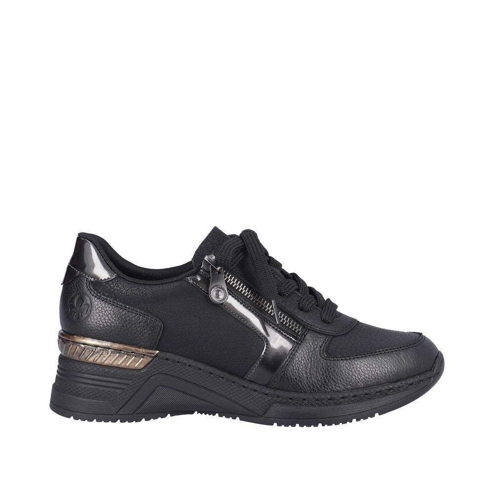 Cette élégante chaussure compensée Rieker allie style et praticité. Ses lacets plats marron permettent un ajustement parfait, tandis qu’une délicate plaque dorée ornée de la fleur de lys, emblème de la marque, apporte une touche raffinée. La fermeture éclair latérale facilite l’enfilage au quotidien.